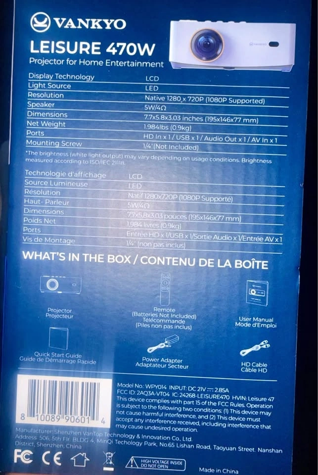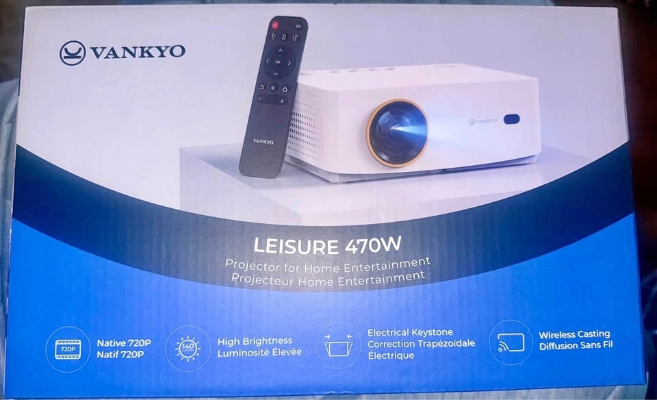Selling a brand new Vankyo Leisure 470W portable projector. Perfect for home entertainment, movies, games, streaming and more. Features 720p native resolution (1080p supported), LED light source, built-in speaker, and HDMI + USB + AV ports. Comes with power adapter and remote. Condition is 100% new with original packaging. Never opened or used. Great budget option for home theater or dorm setup.