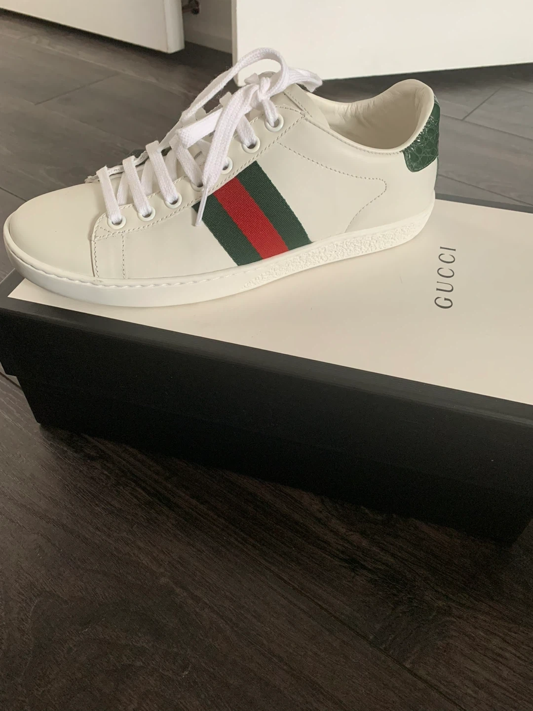 Classic Gucci Ace sneakers in white leather. Features the signature green and red stripe detail. The heel is accented with green crocodile embossed leather. Includes original box and dust bag.