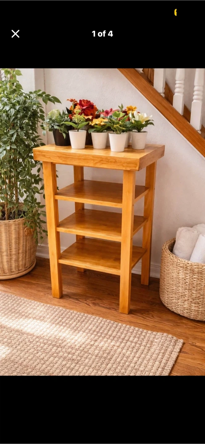 A nice wooden tiered stand with three shelves. It's a lovely piece for displaying plants or decor. Great for adding a bit of height to your displays!