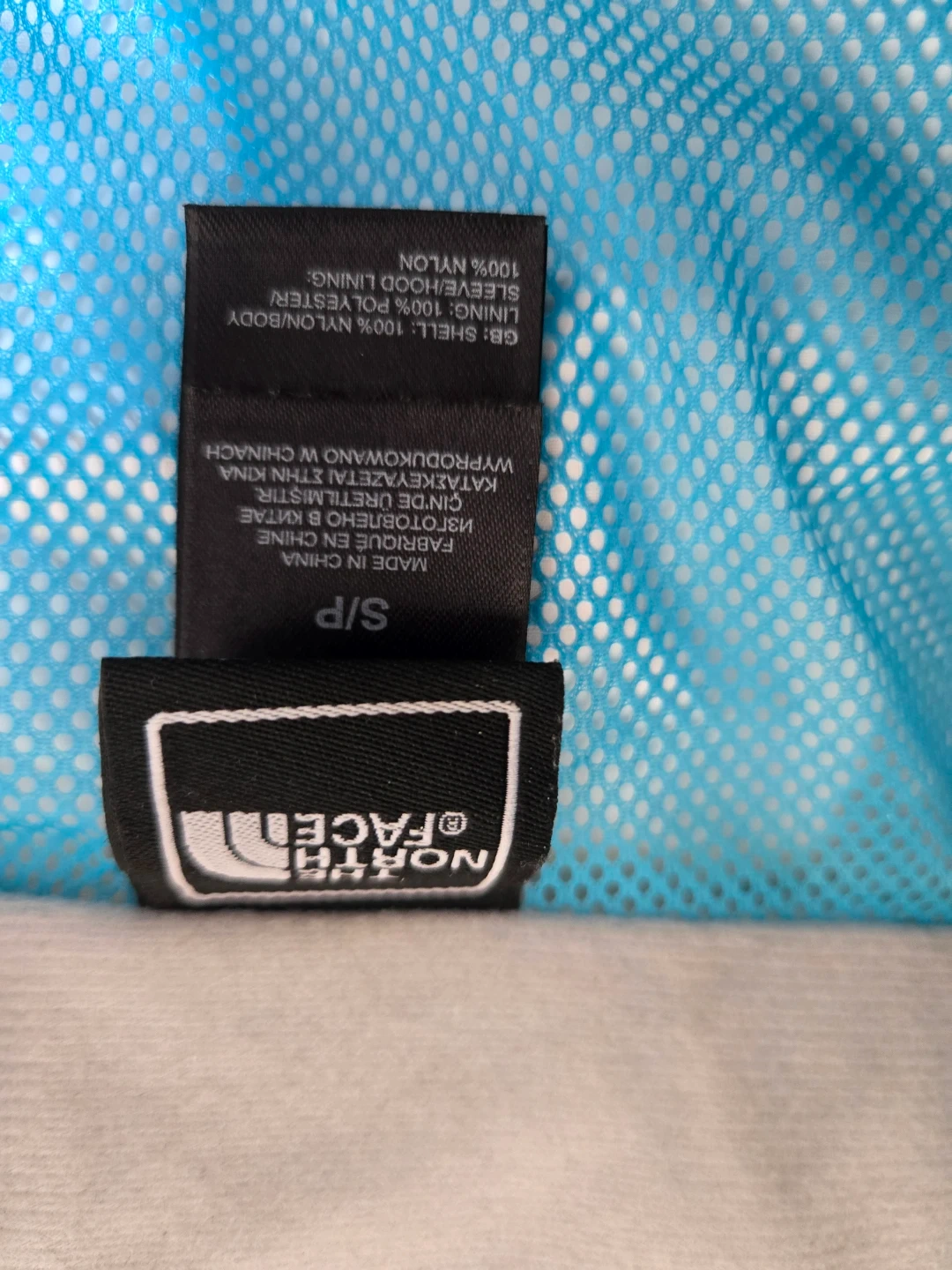 This is The North Face women's hooded rain jacket. It's made of 100% nylon shell and 100% polyester sleeve/hood lining. This jacket is a size S/P.
