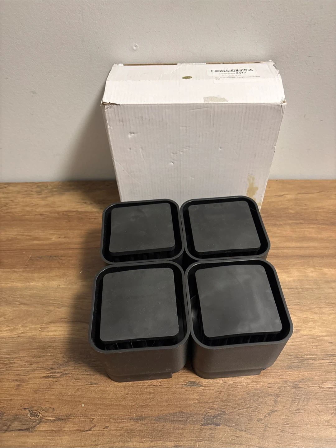 Set of four black furniture risers. These are made of durable plastic. They're designed to lift furniture for better accessibility or storage underneath.