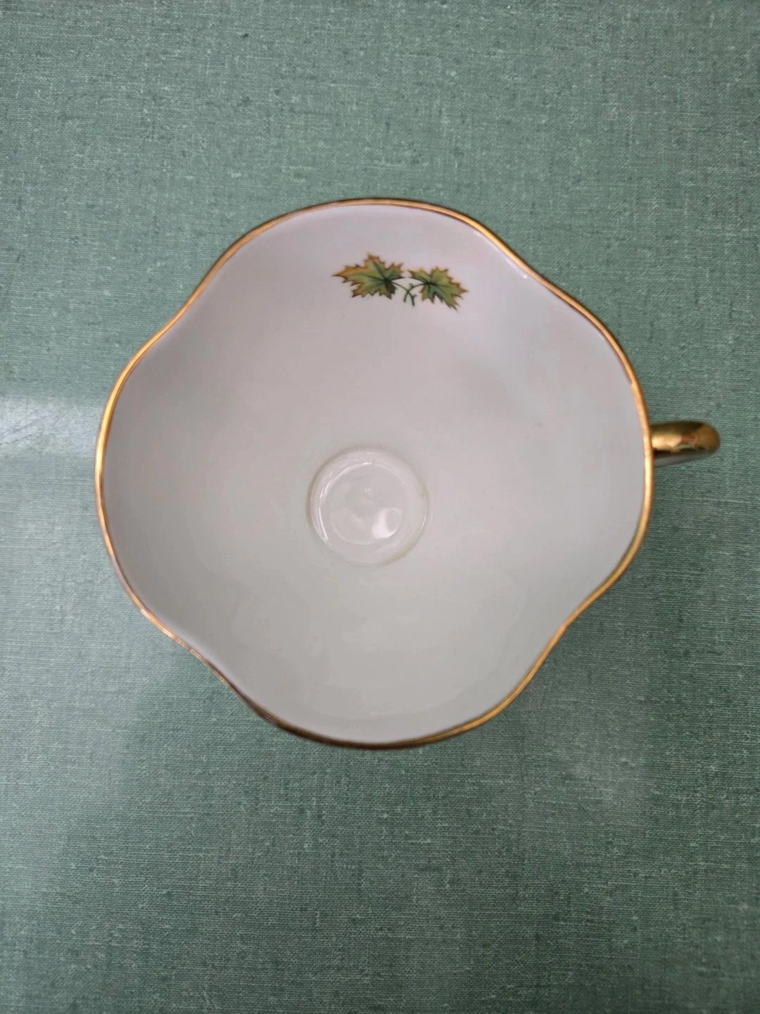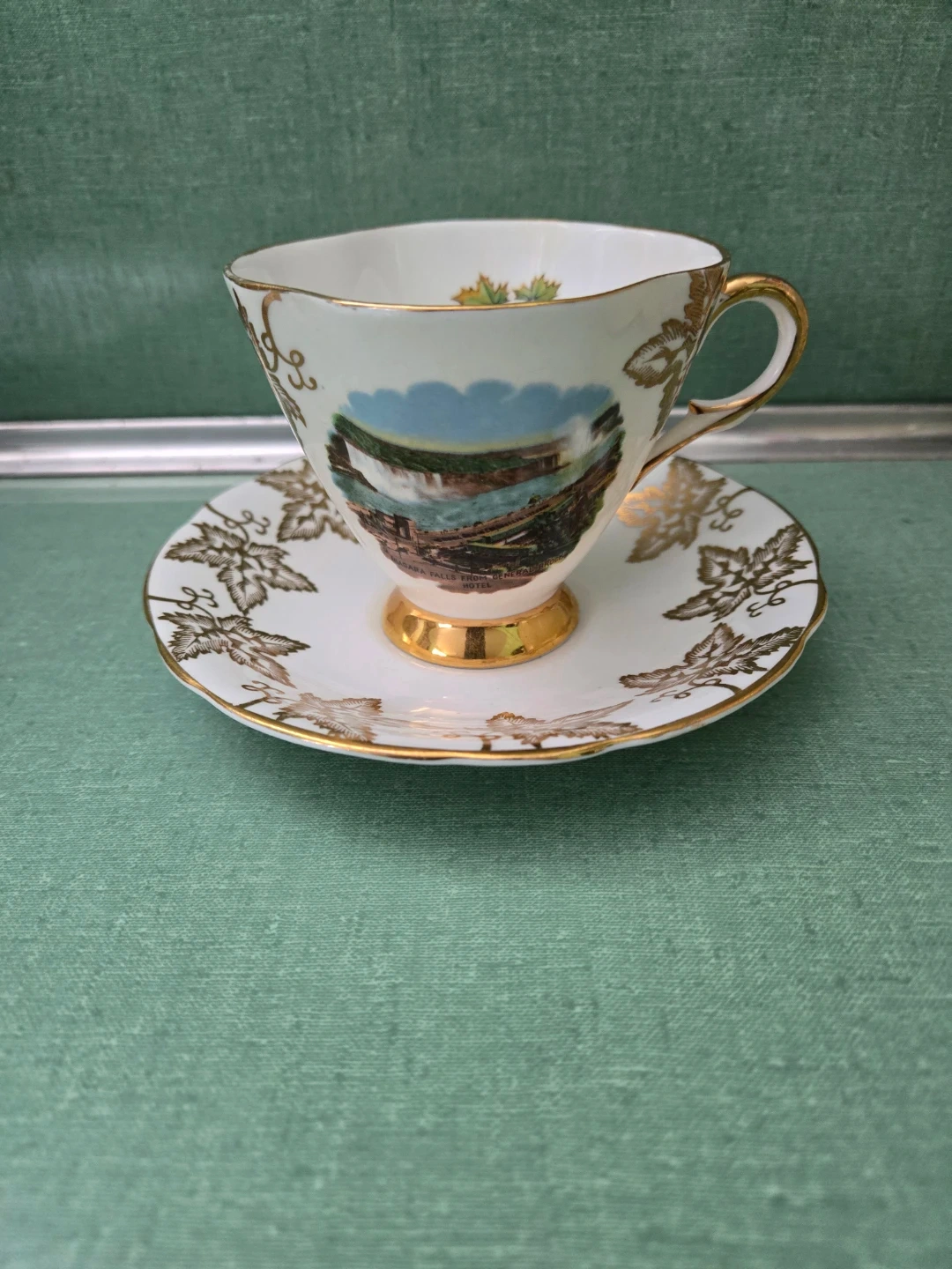 Beautiful scene of Niagara Falls on front of tea cup with surrounding gold maple leafs