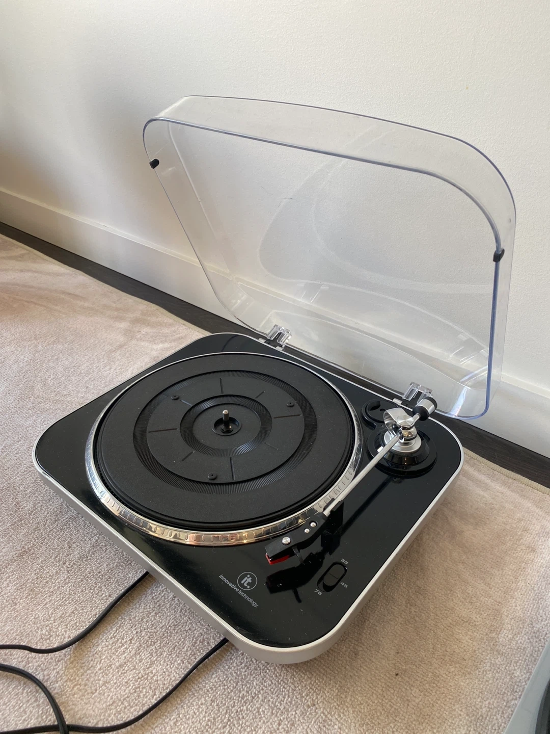 This is an IT. Innovative Technology turntable. It has speed settings for 33 and 45 RPM records. The clear dust cover is included. Plays your favourite vinyl!