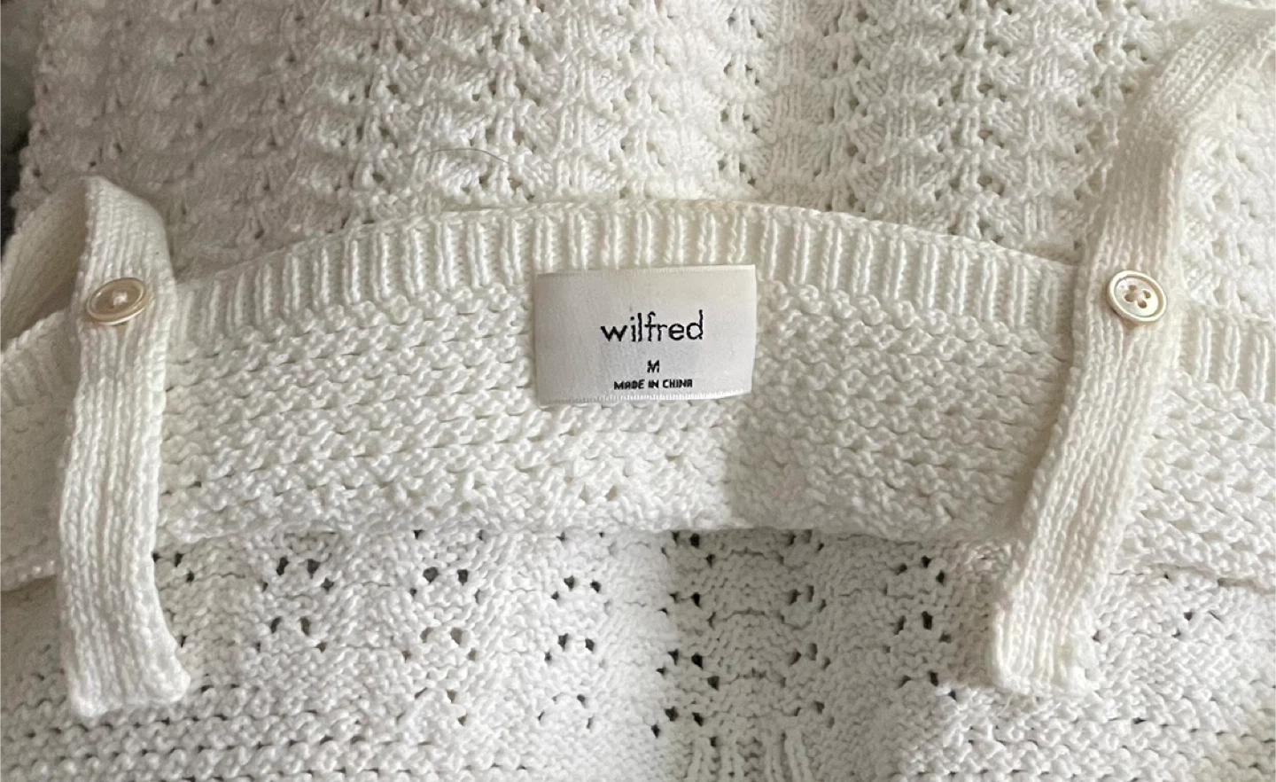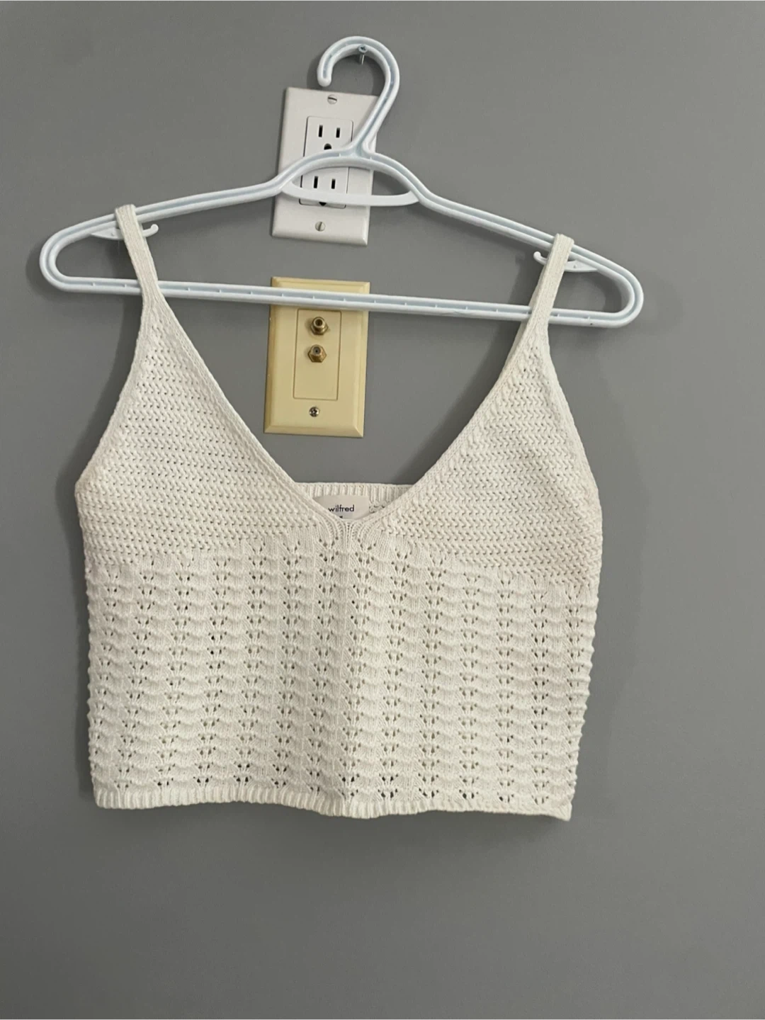 White knit cropped tank top by Wilfred. Size medium. Features adjustable spaghetti straps and a V-neck. This top's open knit pattern makes it perfect for layering or warm weather wear!