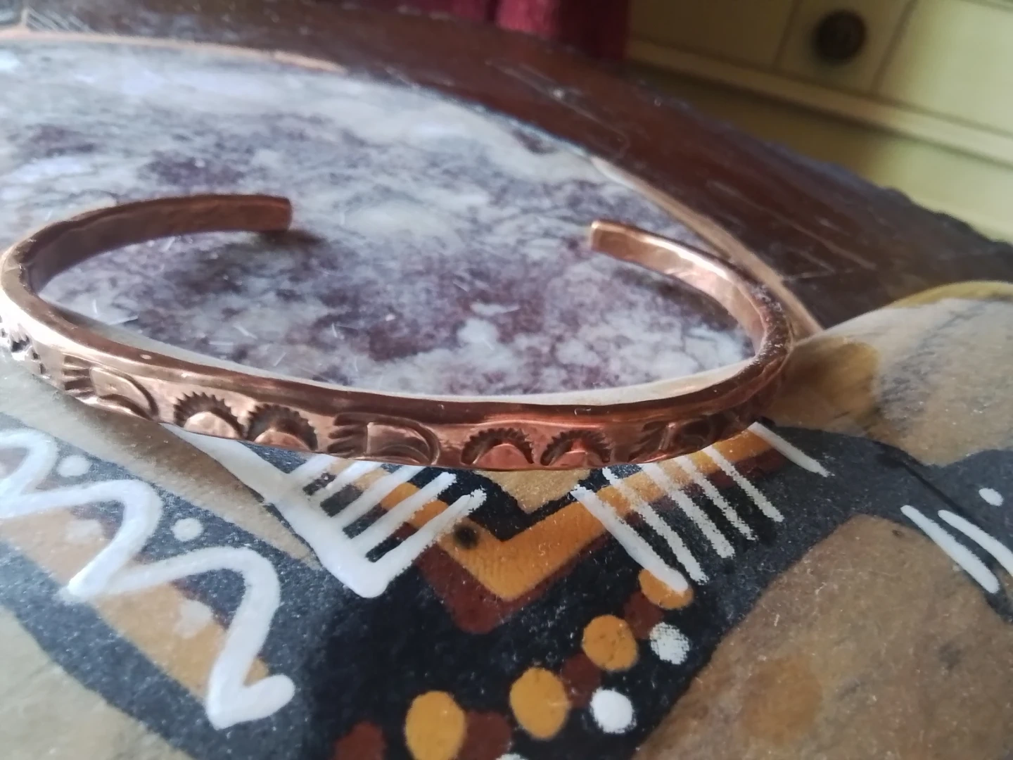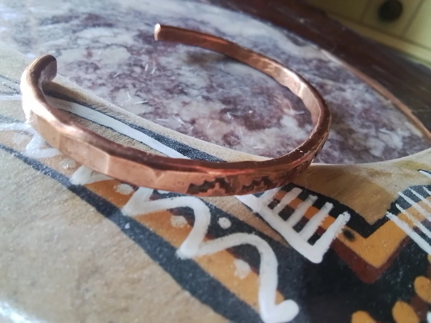 Handmade copper cuff bracelet with engraved detailing. Adjustable size. Copper material.