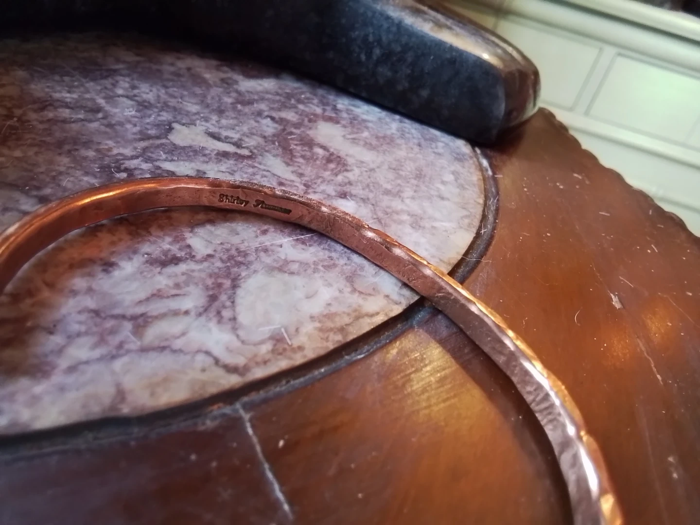 This is a used, vintage Navajo artisan copper open cuff bangle, signed by Shirley Plummer, showcasing unique craftsmanship. It's a distinctive piece of wearable art.