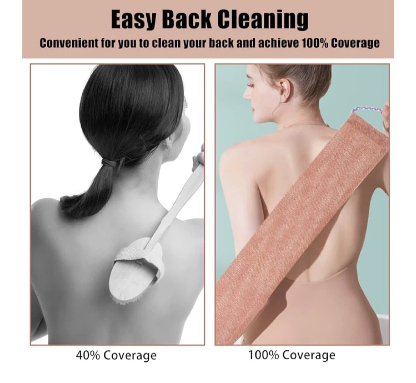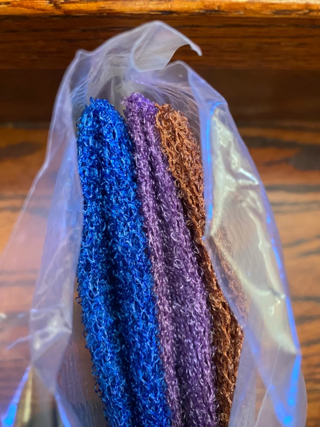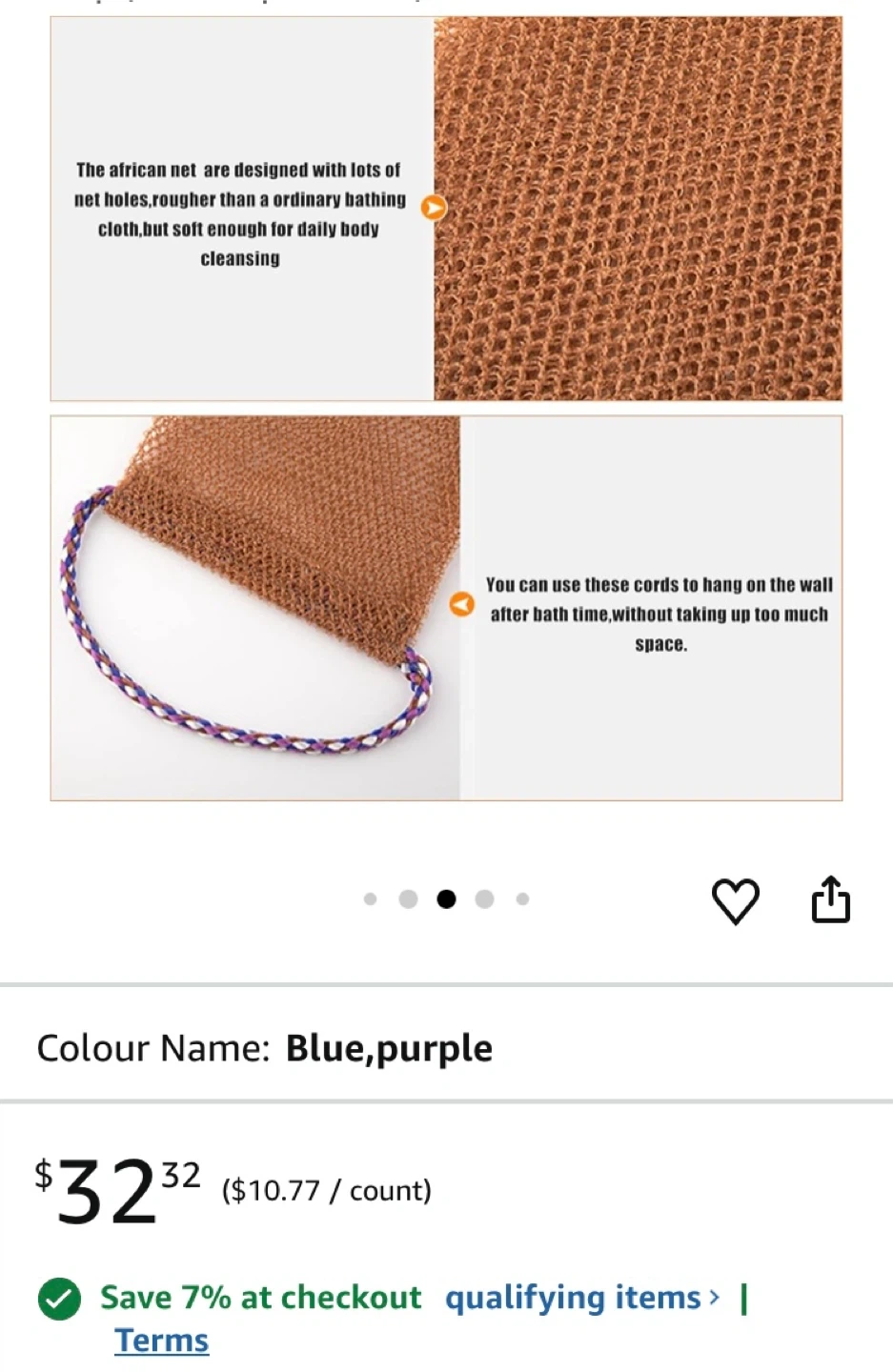 This set includes three African net sponges designed for daily body cleansing. They are rougher than a standard bathing cloth but soft enough for everyday use. The sponges feature cords for hanging on the wall after bath time, saving space. They are approximately 29.5 inches long and 5.5 inches wide.