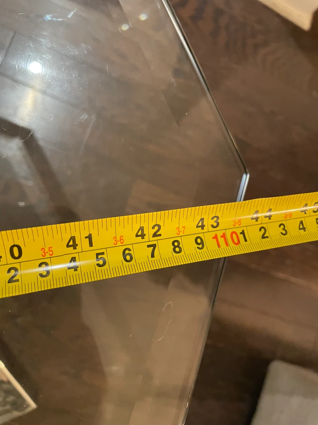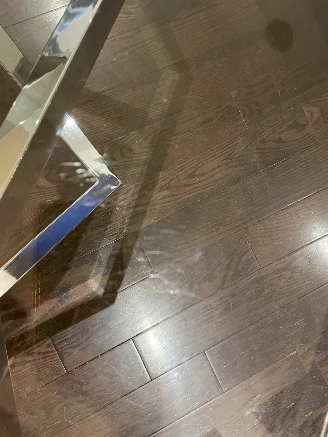 Selling a modern glass coffee table with a unique chrome base design. It has an octagon shape and measures approximately 44 inches across. Minor wear and tear - see last picture.