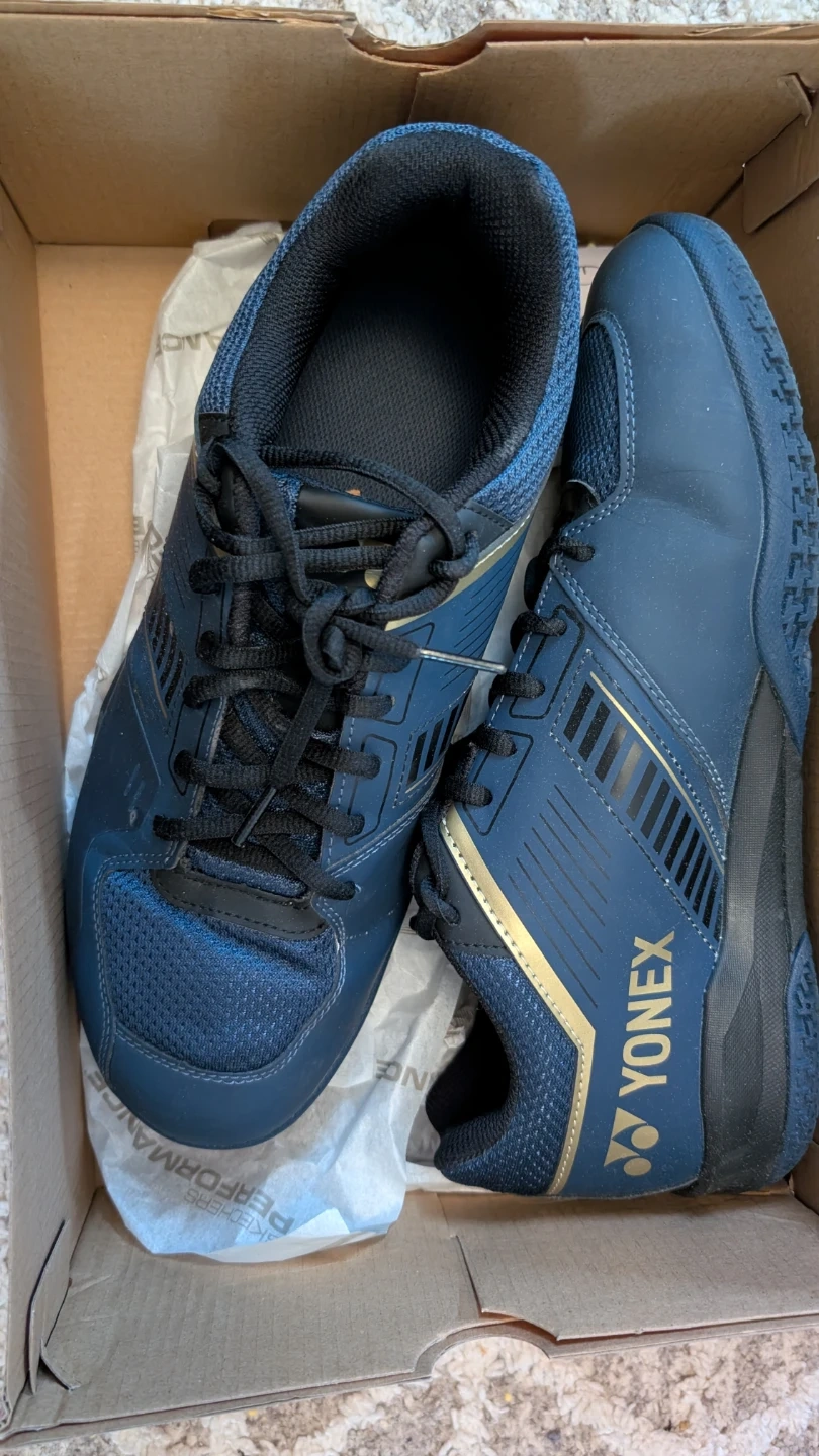 Yonex Power Cushion pickleball shoes in navy and gold. These shoes feature excellent shock absorption and support for agile play. Size is 10.5. Excellent condition, used one Day only.
