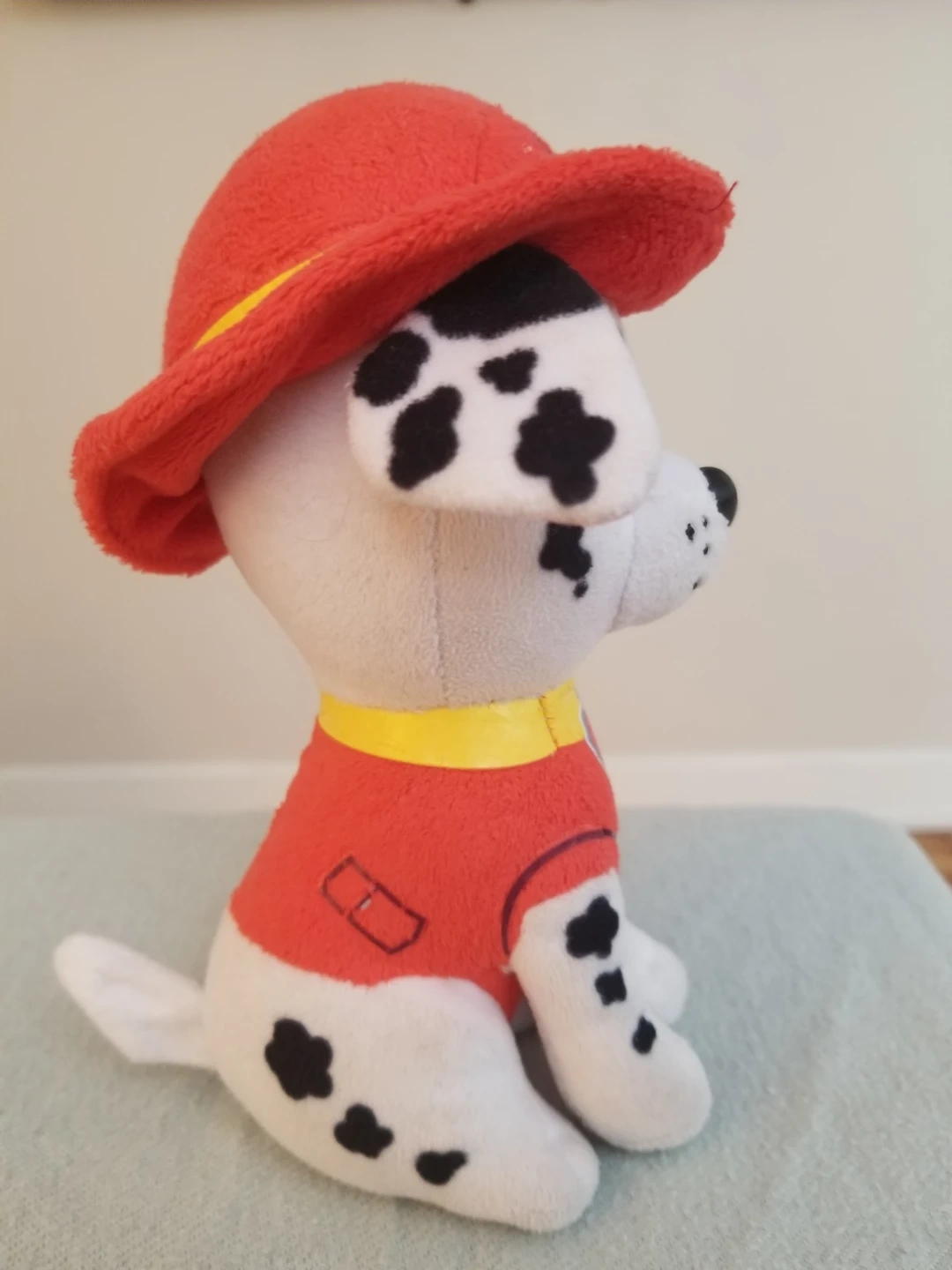 This is a soft plush toy of Marshall from Paw Patrol. It features his signature firefighter hat and uniform. It's made from cuddly material, perfect for any Paw Patrol fan! OBO