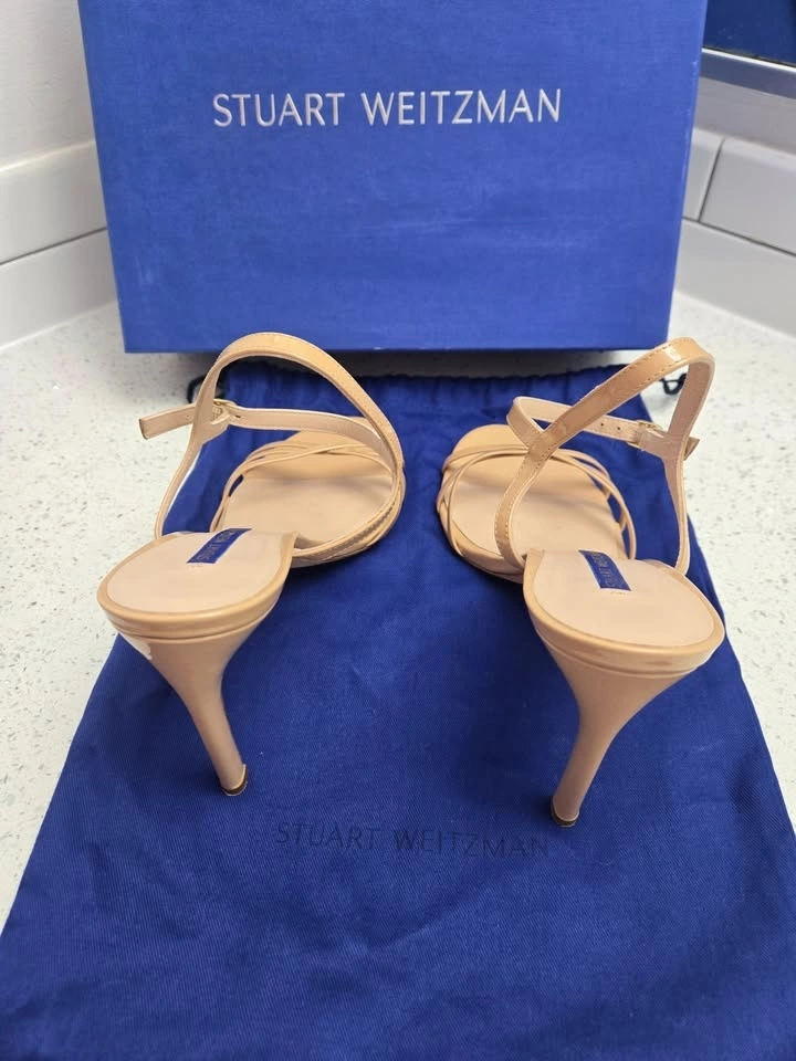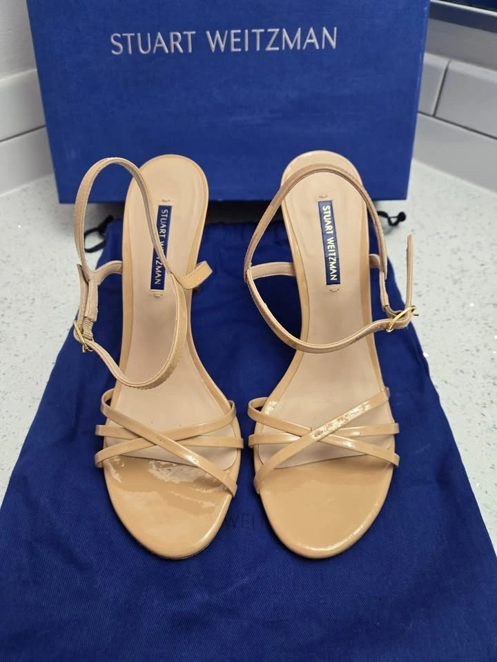 Stuart Weitzman Starla 105 Adobe Patent Leather Heels. Original Price $545 (with taxes) Size 9M. Includes Dusting Bag & Original Box. Open toe, buckled ankle strap with elastic gore, crossover straps at toe. 4" heel. Leather upper, leather lining and sole. Made in Spain. Only worn three to four times - the only marks on them are on the bottom sole (last picture). Selling them as I can't wear them since I had foot surgery.