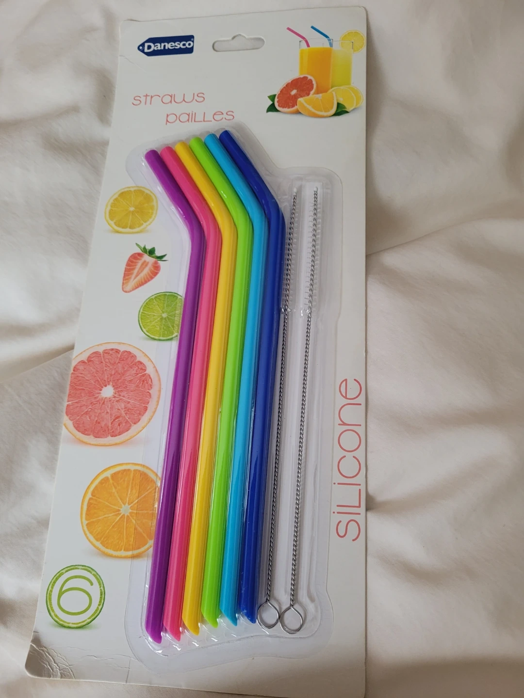 FREE! New in packaging, fun and bright silicone straws are reusable and non-toxic. They're ideal for sipping water, juice, soda, coffee, and more. The set includes 6 straws and 2 cleaning brushes.