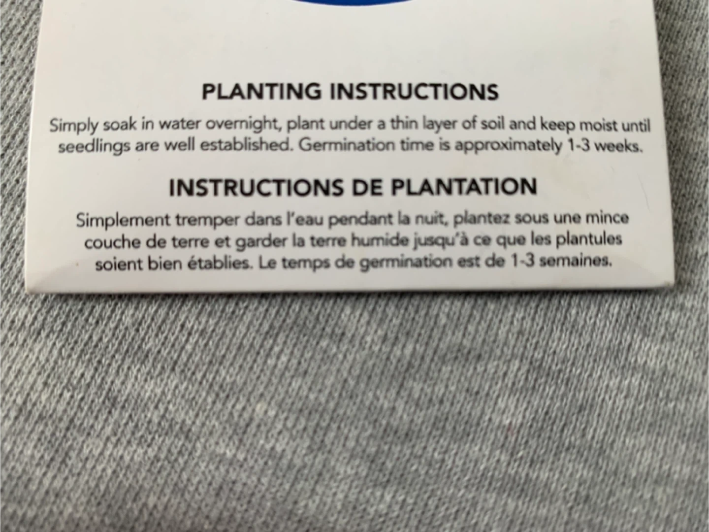 Begin your gardening journey with this seed packet! Planting instructions include soaking seeds overnight and planting under a thin layer of soil. Germination time is approximately 1-3 weeks.