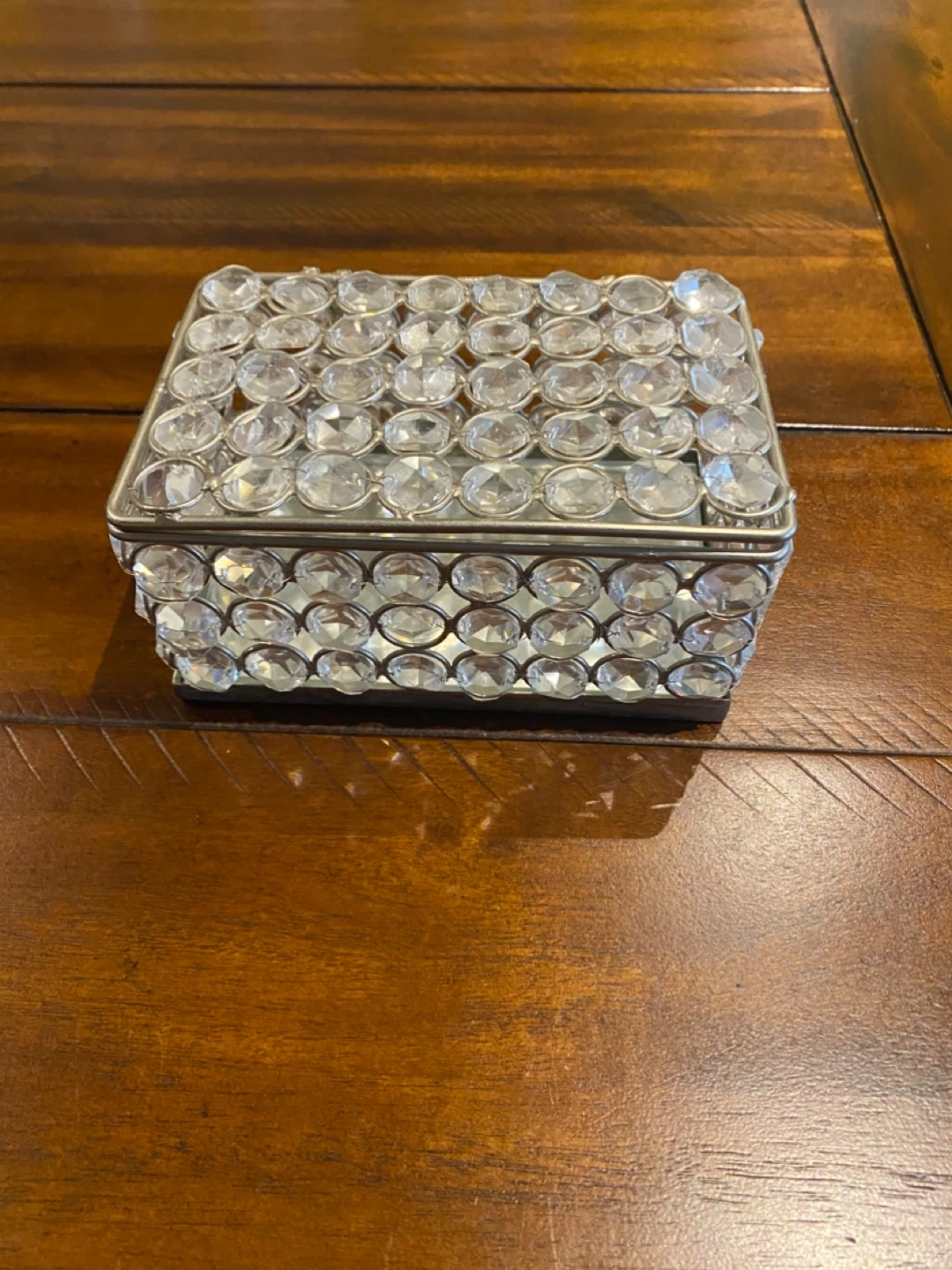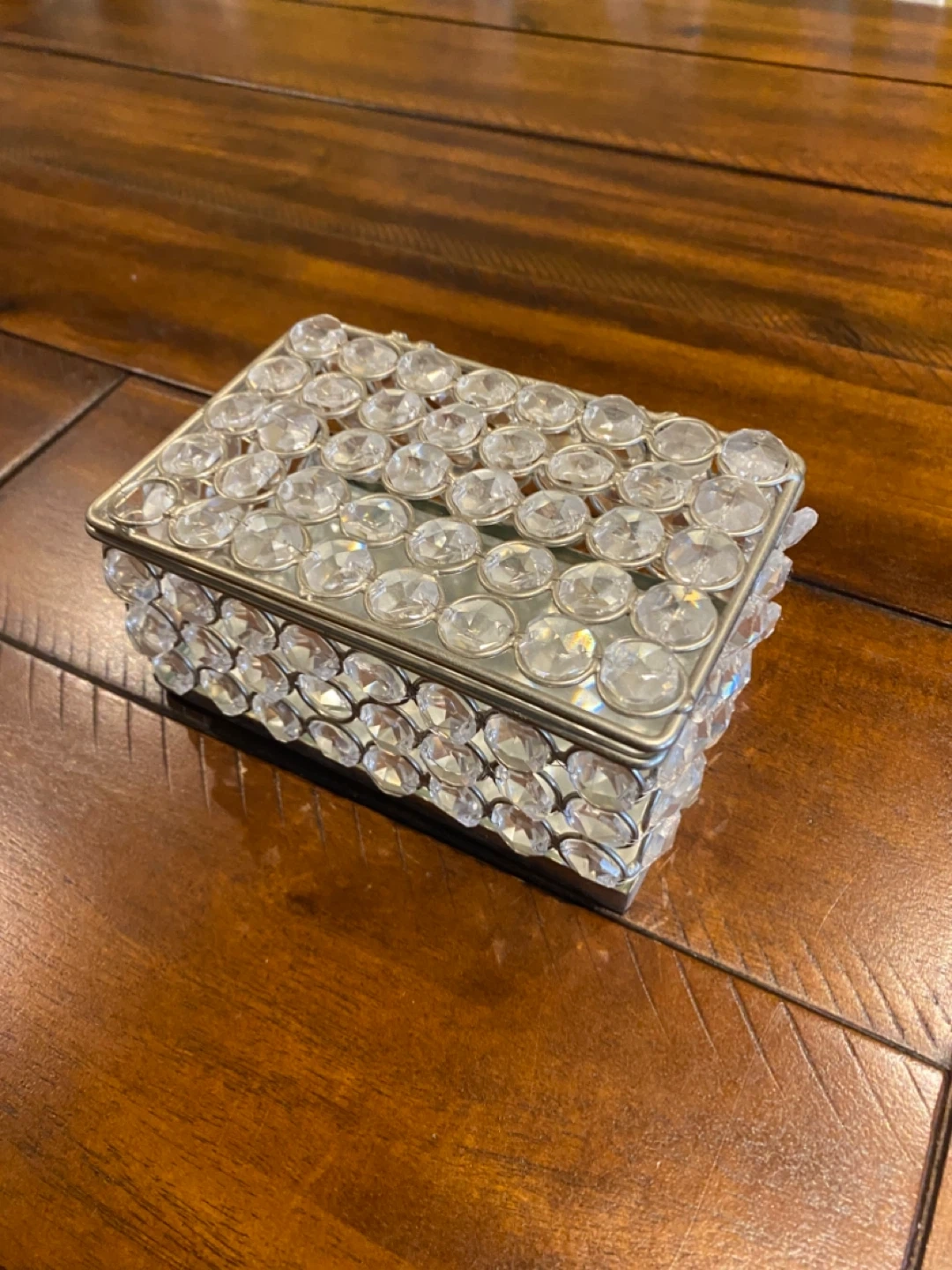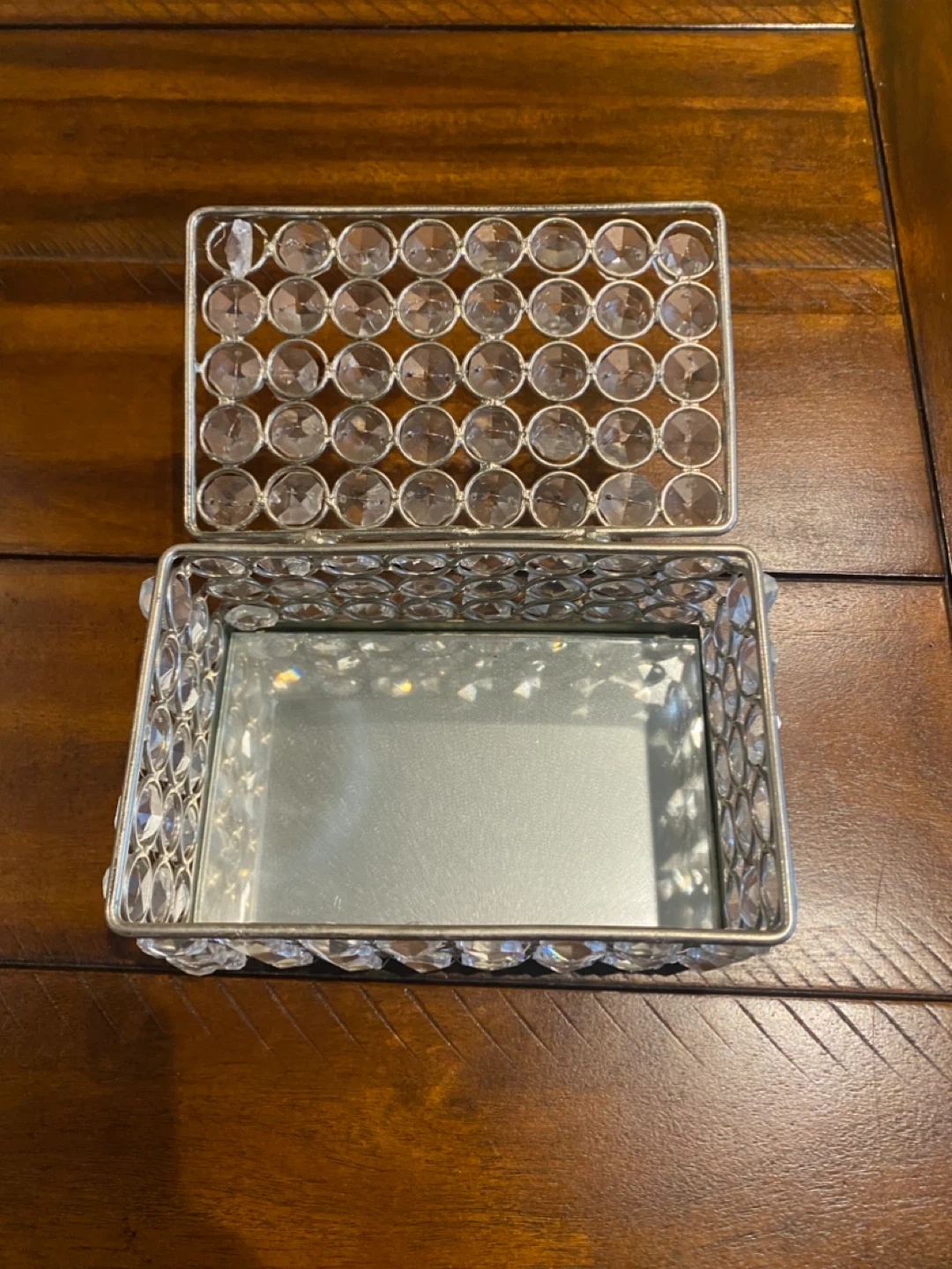 Ashuley Sparkly decorative box, perfect for holding small trinkets or jewelry. It's covered in clear rhinestones with a silver-toned metal frame. The inside is mirrored.