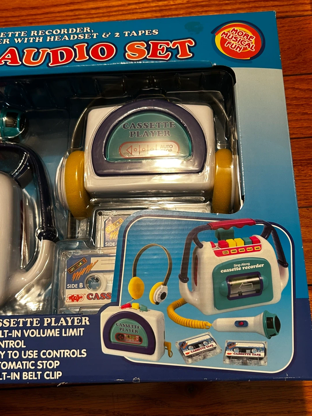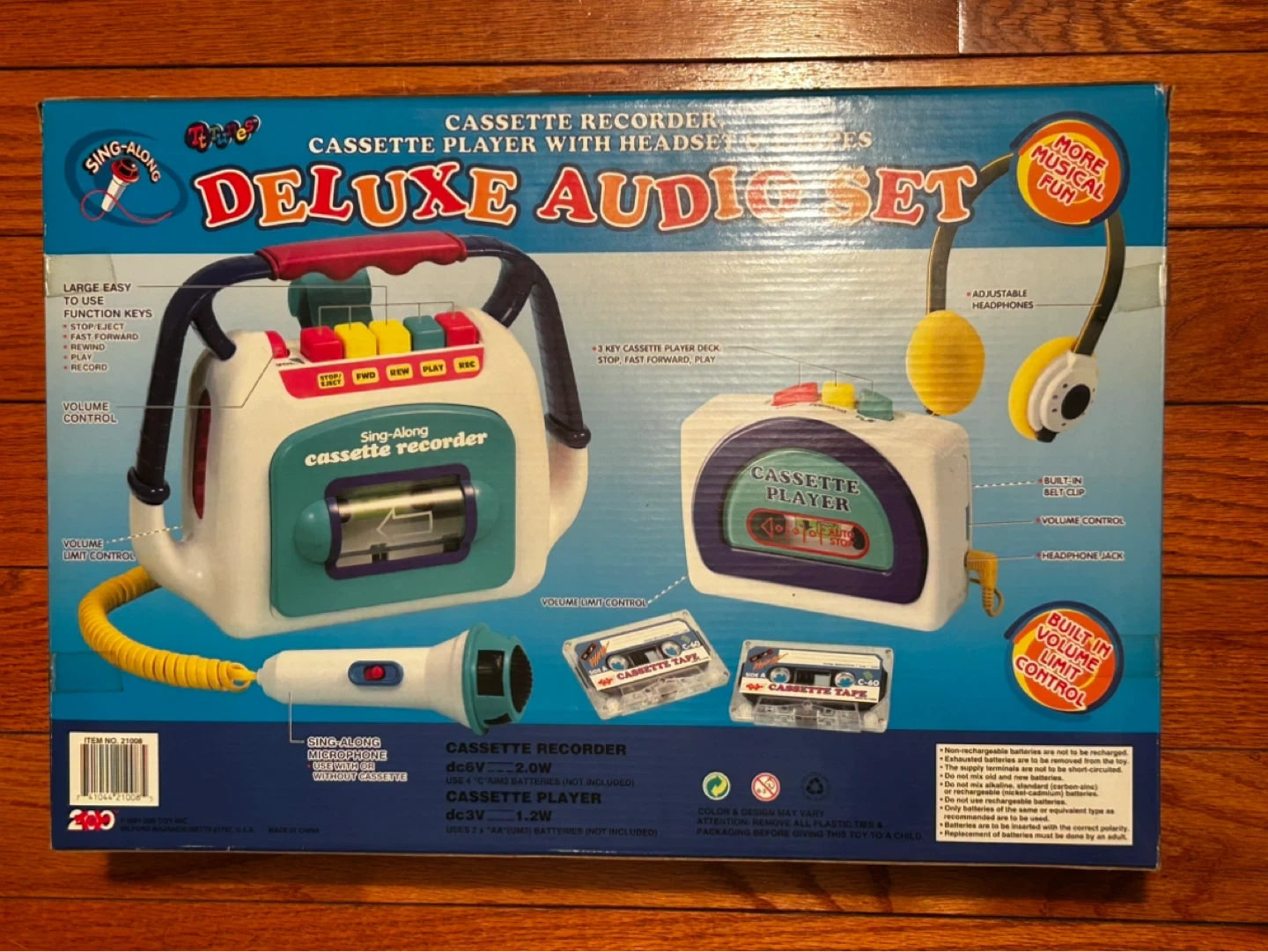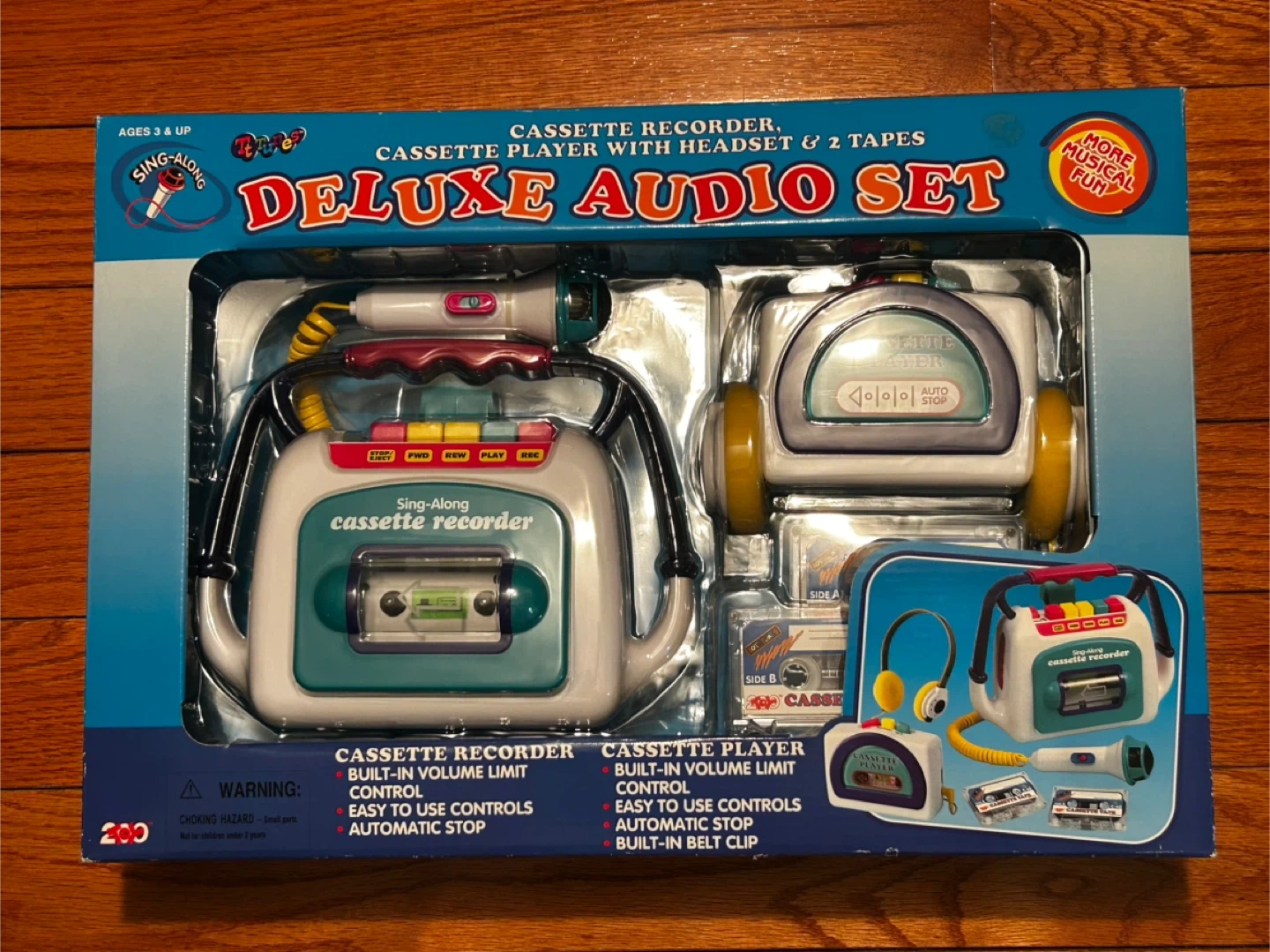 Fun early-2000s kids audio toy set by 200 Toys Inc. This Sing-Along Deluxe Audio Set includes a cassette recorder, cassette player, headset microphone, and toy tapes — all in the original retail box.