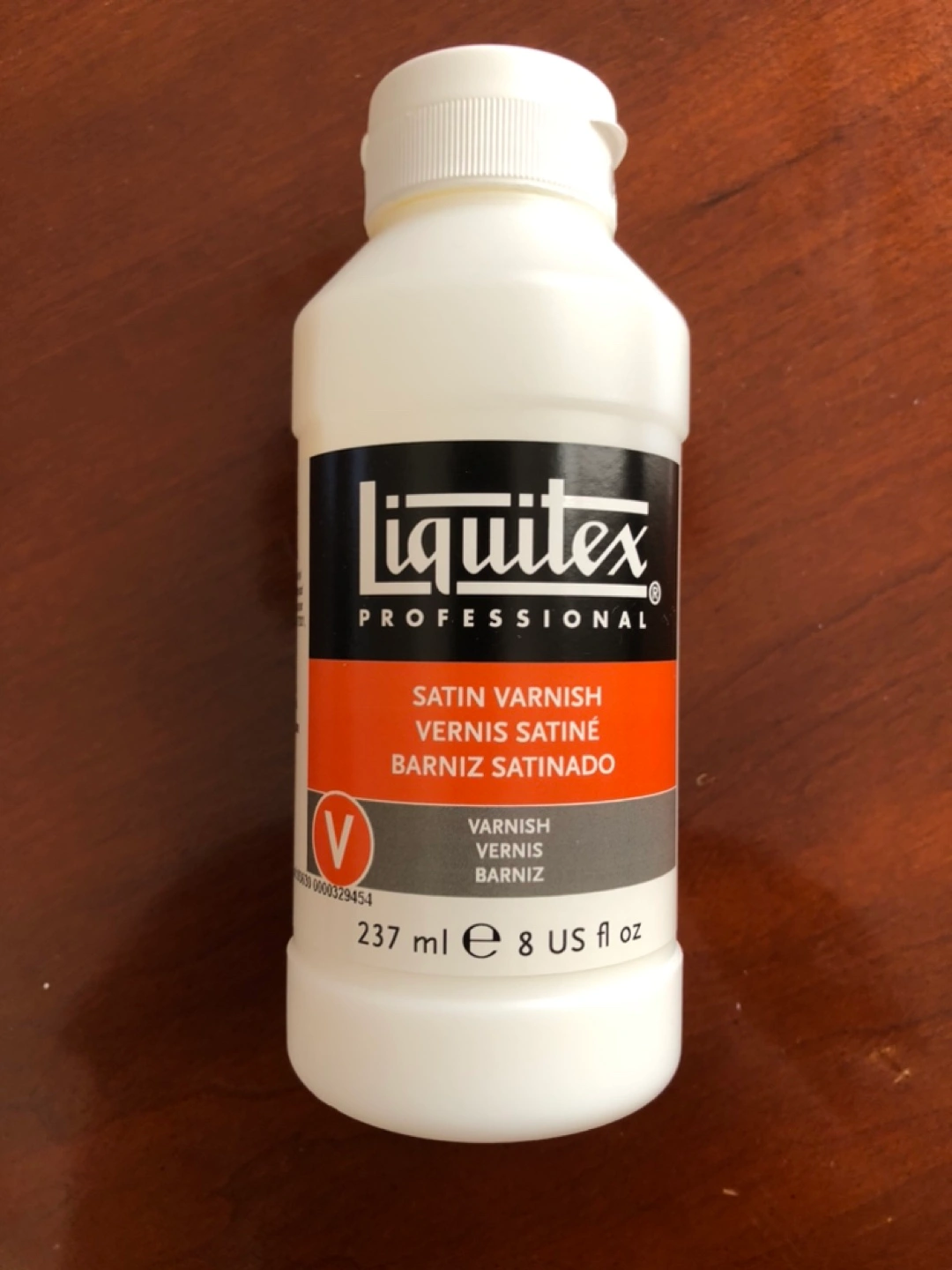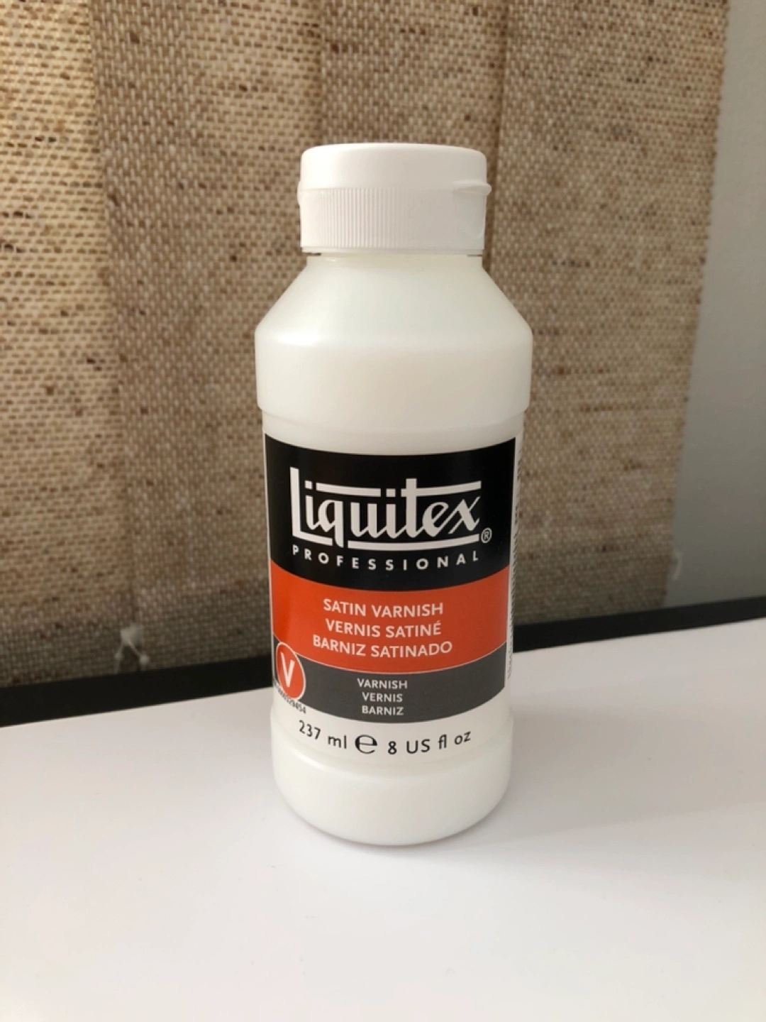 237 ML bottle of Liquitex satin varnish for paintings. Poured out a couple drops to try, but ended up using a spray varnish.