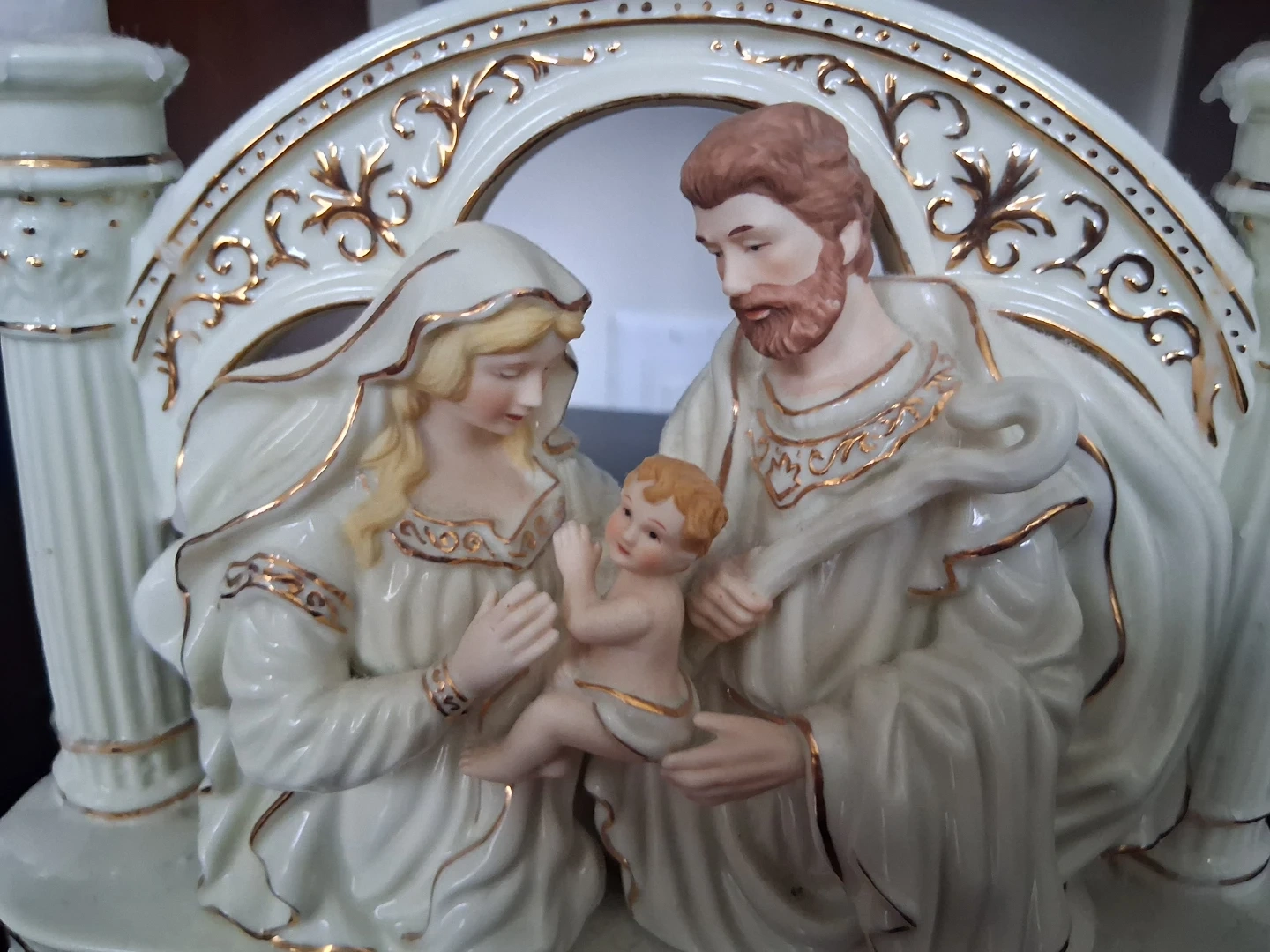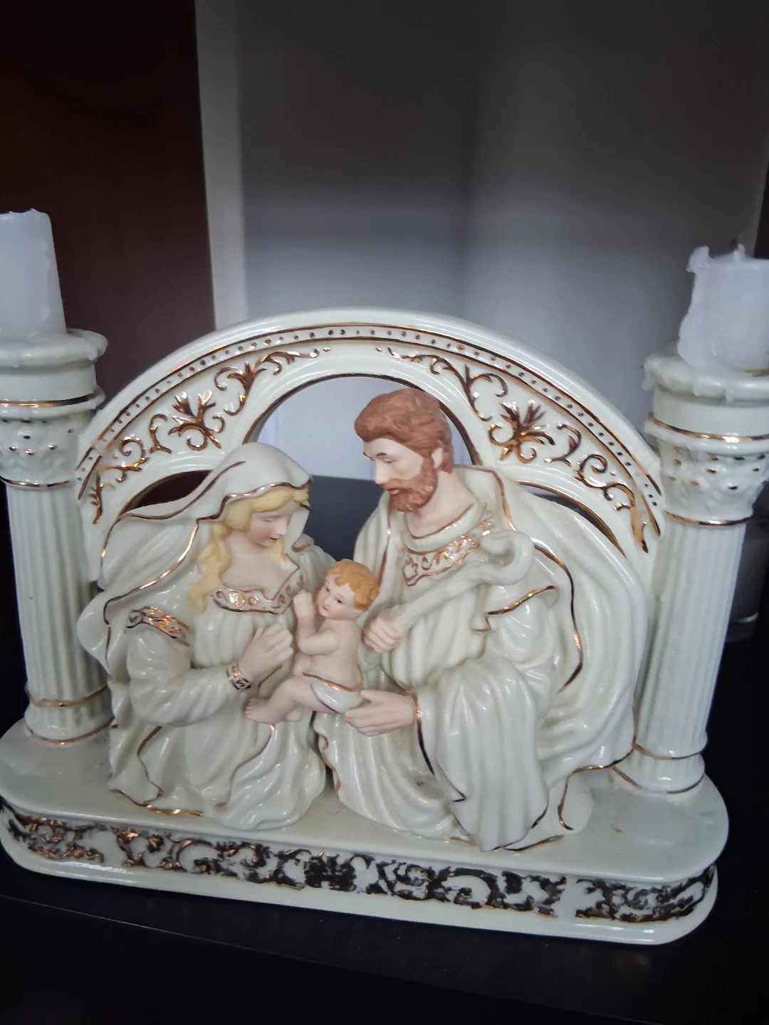 This is a beautiful Holy Family nativity scene figurine with a candelabra. It features Joseph, Mary, and the baby Jesus in a creamy white porcelain with gold trim accents. The piece has an ornate arched frame with decorative detailing and two candle holders.