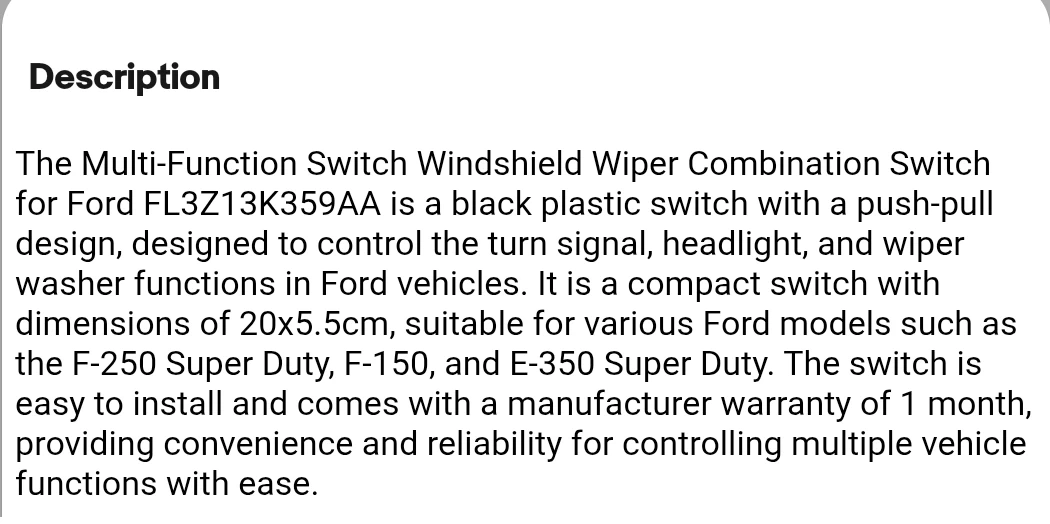 This is a black plastic multi-function switch for Ford vehicles. It controls turn signals, headlights, and windshield wipers. It's a compact switch suitable for models like the F-250 Super Duty, F-150, and E-350 Super Duty.