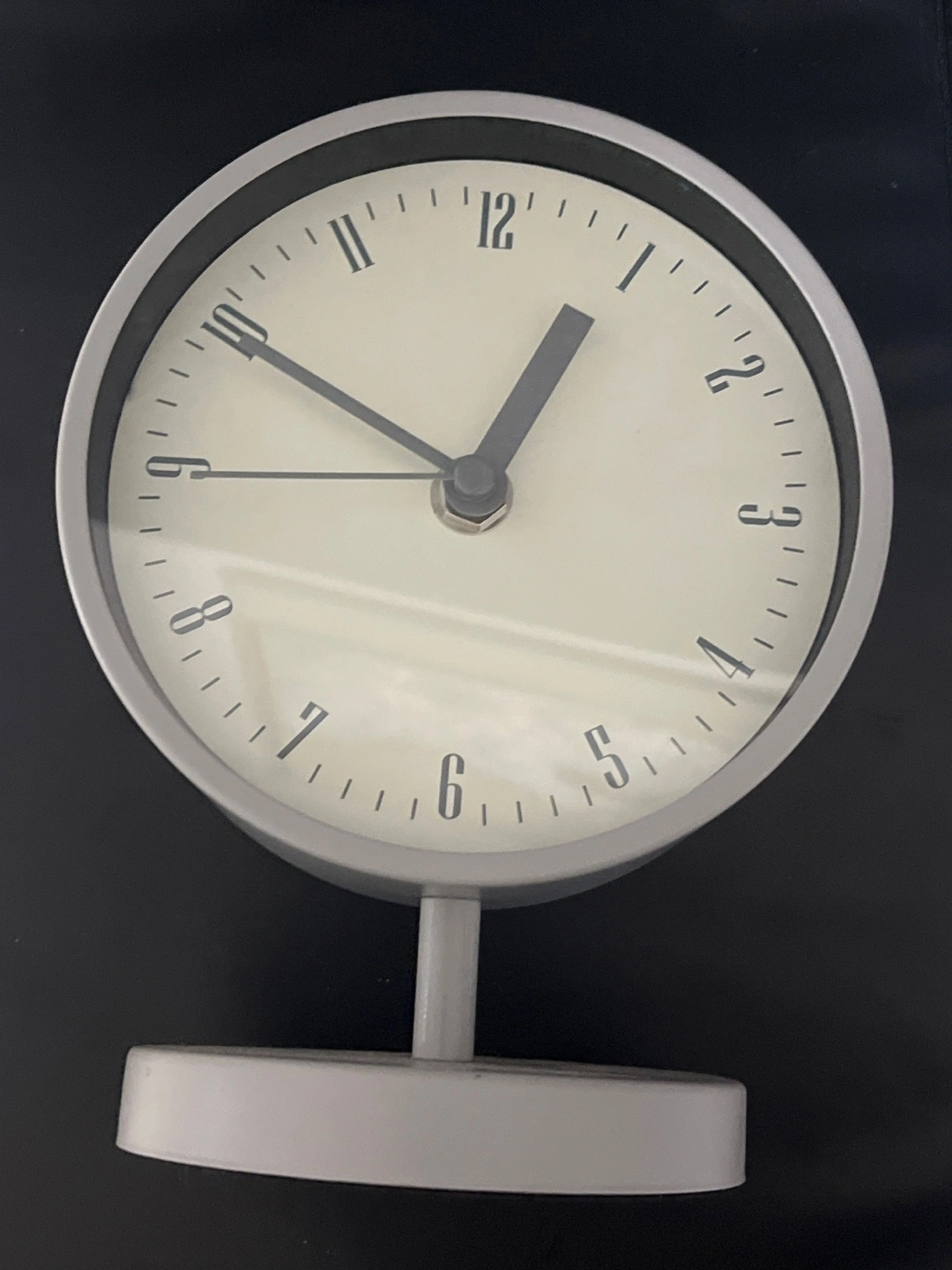 Simple and elegant grey desk clock with a clear analog face. Perfect for your office, bedroom, or study space. Keeps time well and runs quietly.