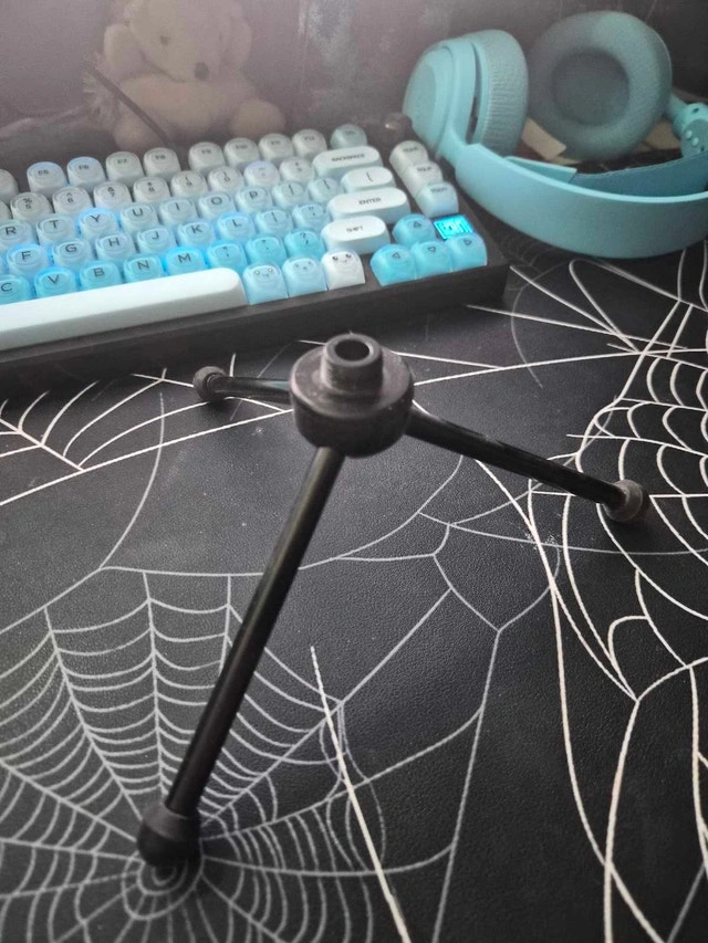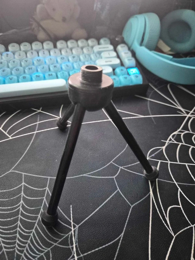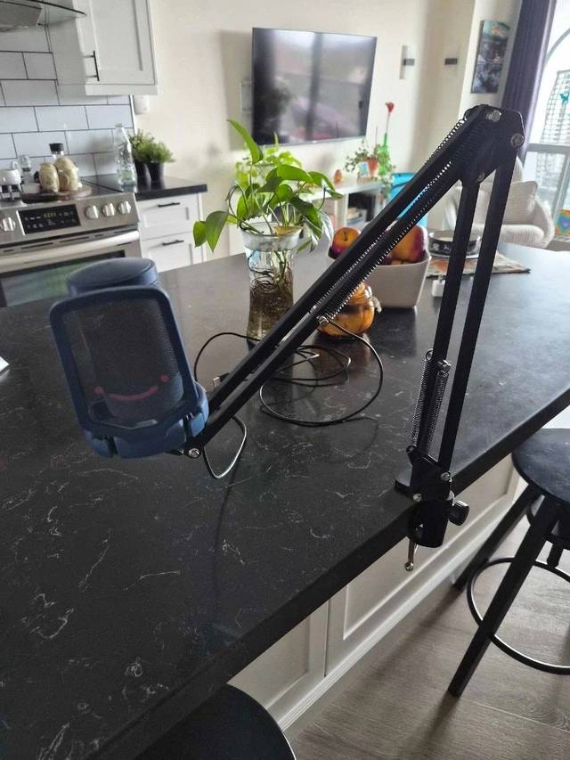 Comes with tripod stand and basically new fifine professional microphone arm with desk clamp up to 2.1" in the box.