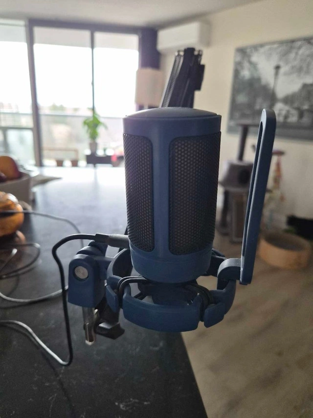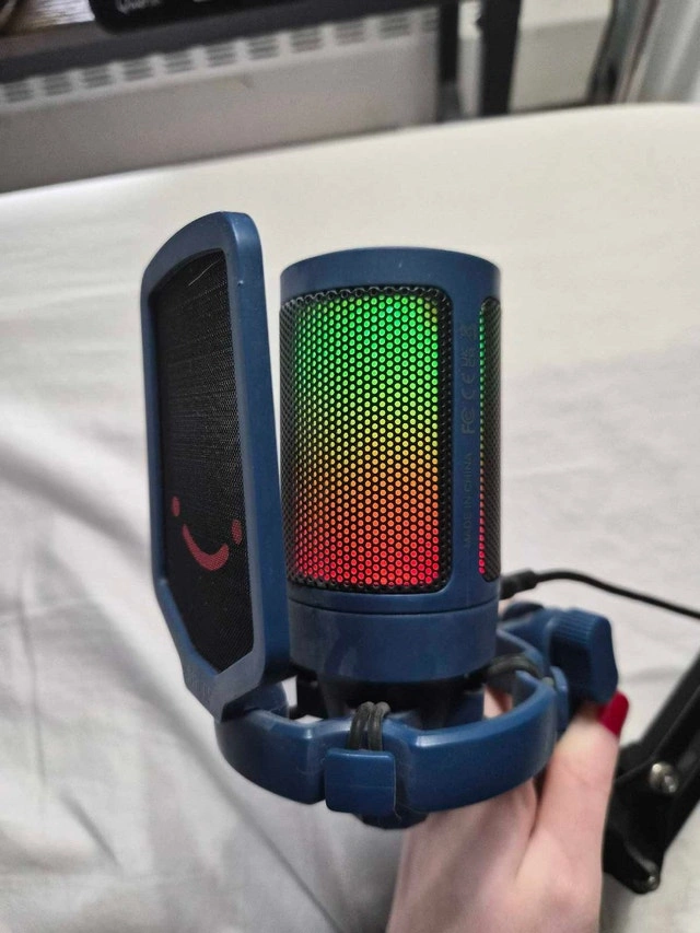 Blue Fifine USB microphone with RGB lighting and mute button, gain control, and pop filter.