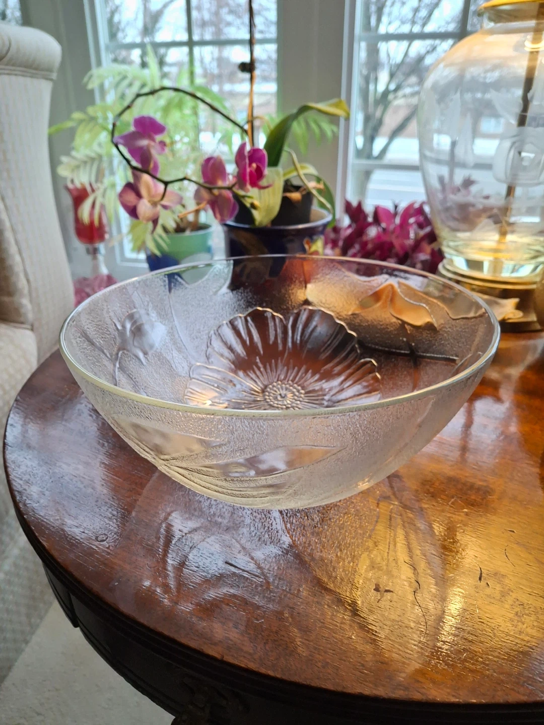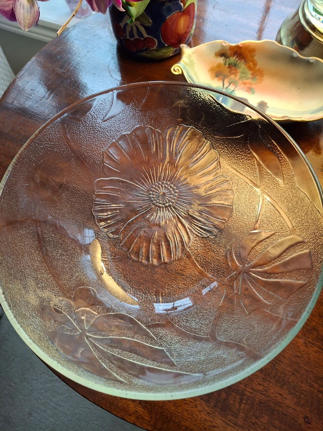 Large clear glass bowl with flower design. Textured on the outside. 10” across and 4” high. Excellent condition.