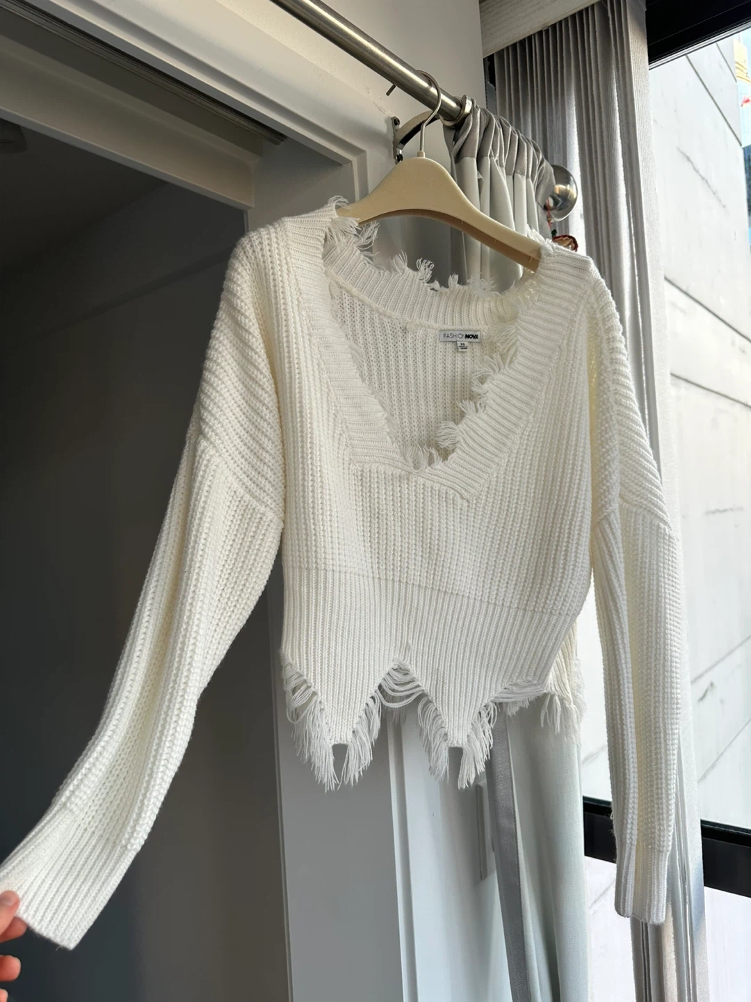 This white knit sweater from Fashion Nova has a V-neck and long sleeves. It features distressed detailing along the neckline and hemline. Looks like a size XS would fit s too