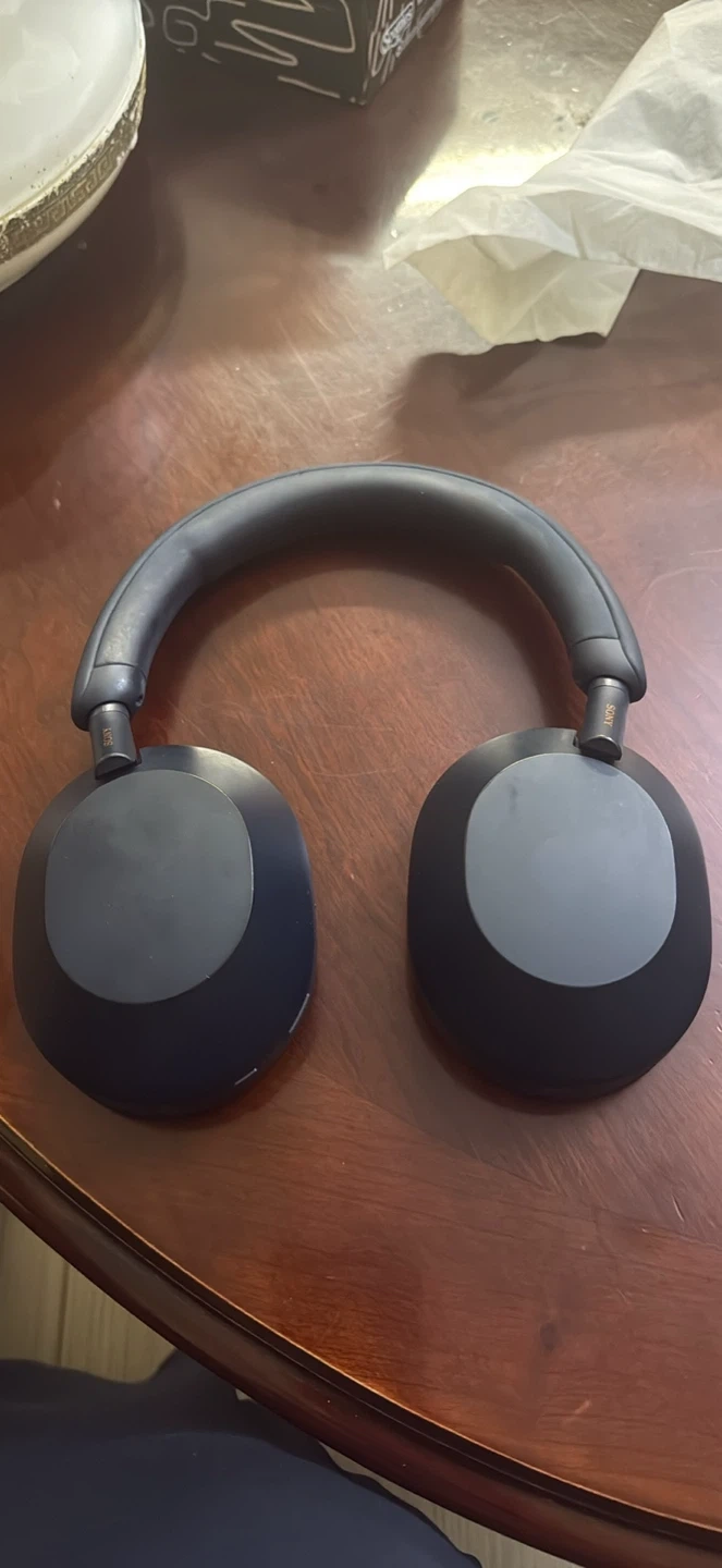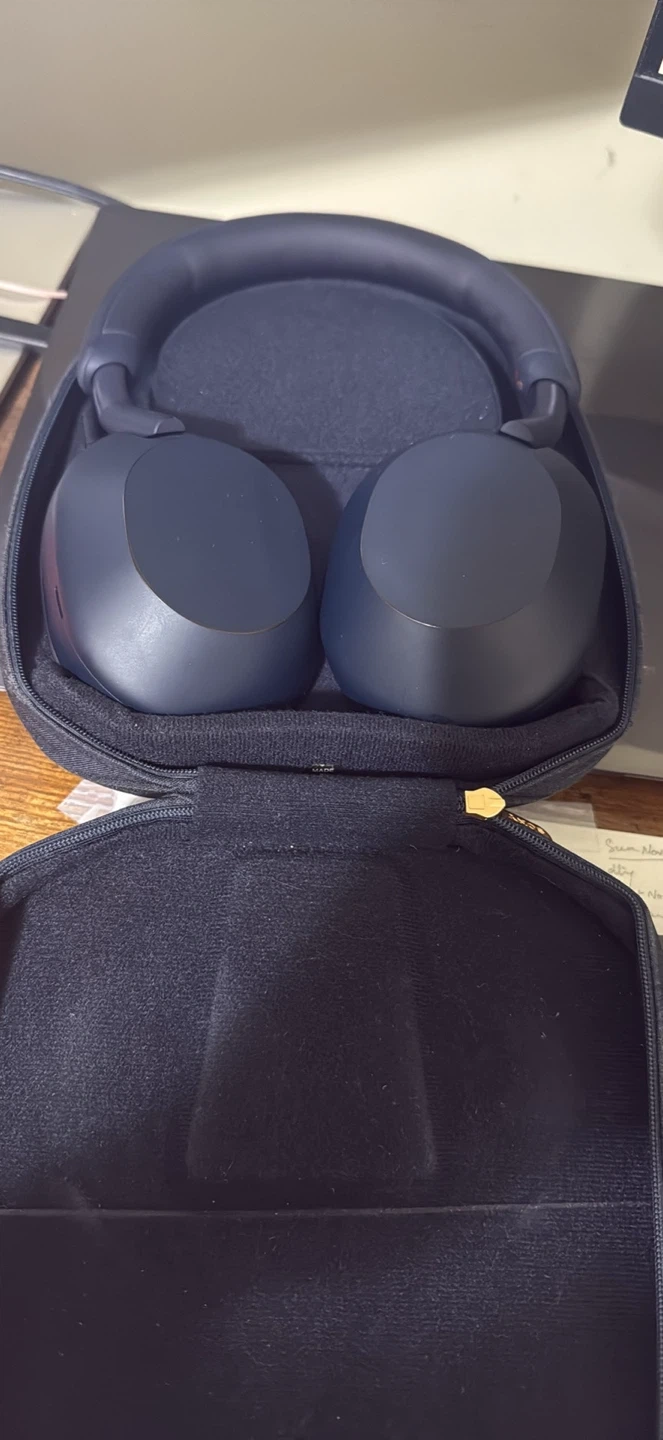 Blue Sony WH-1000XM5 over-ear headphones. Includes charging cable and carrying case. These headphones offer industry-leading noise cancellation. They're great for travel or everyday listening.