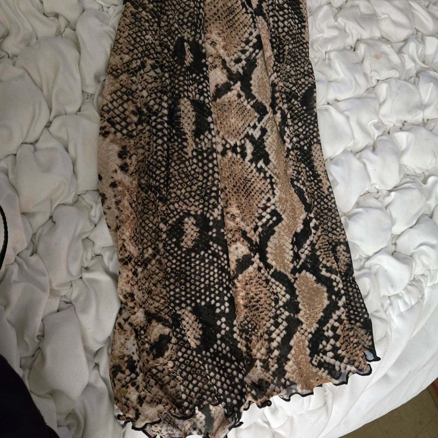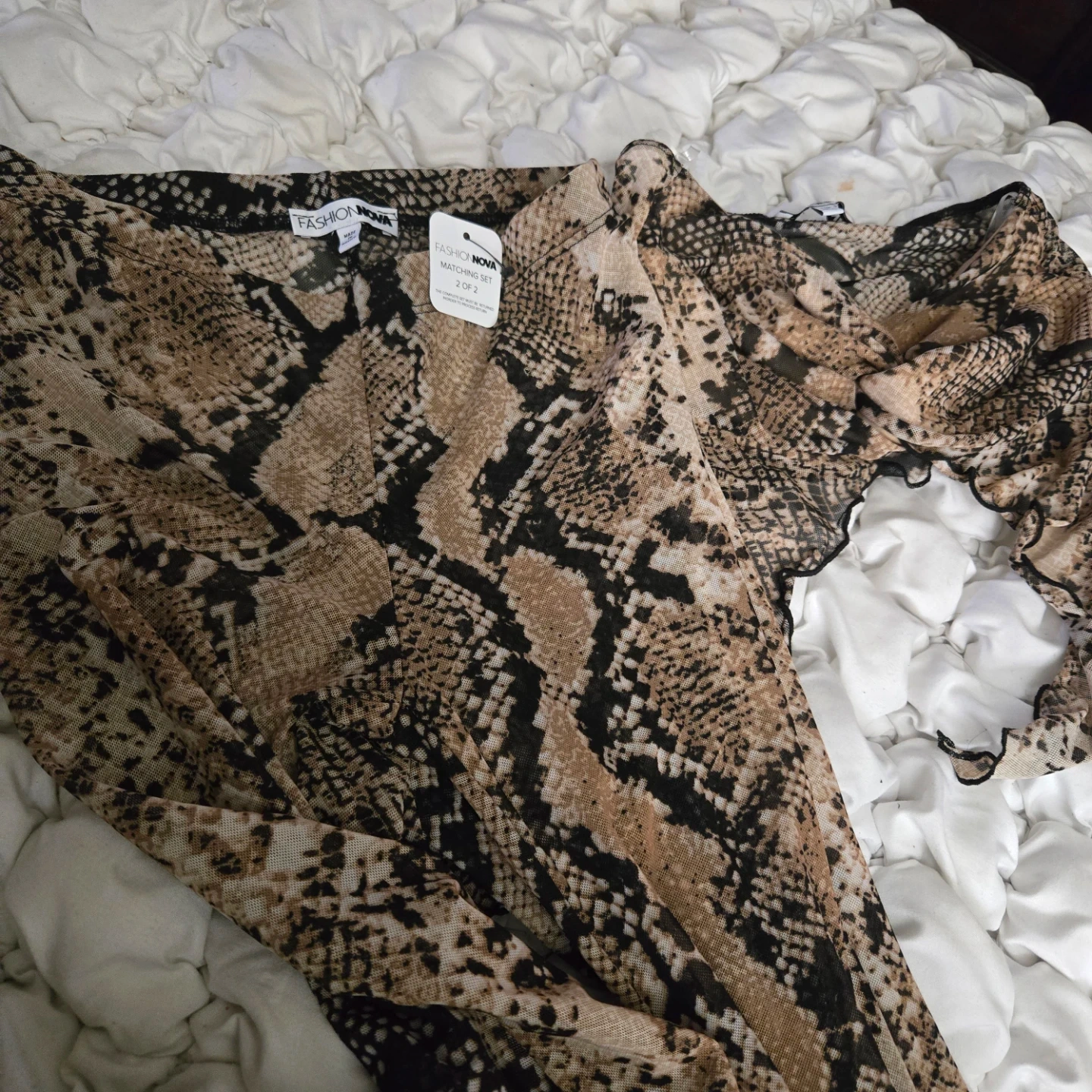 This is a Fashion Nova snake print mesh maxi set. It includes a long-sleeve top and a maxi skirt. The material is sheer mesh with a ruffle trim.