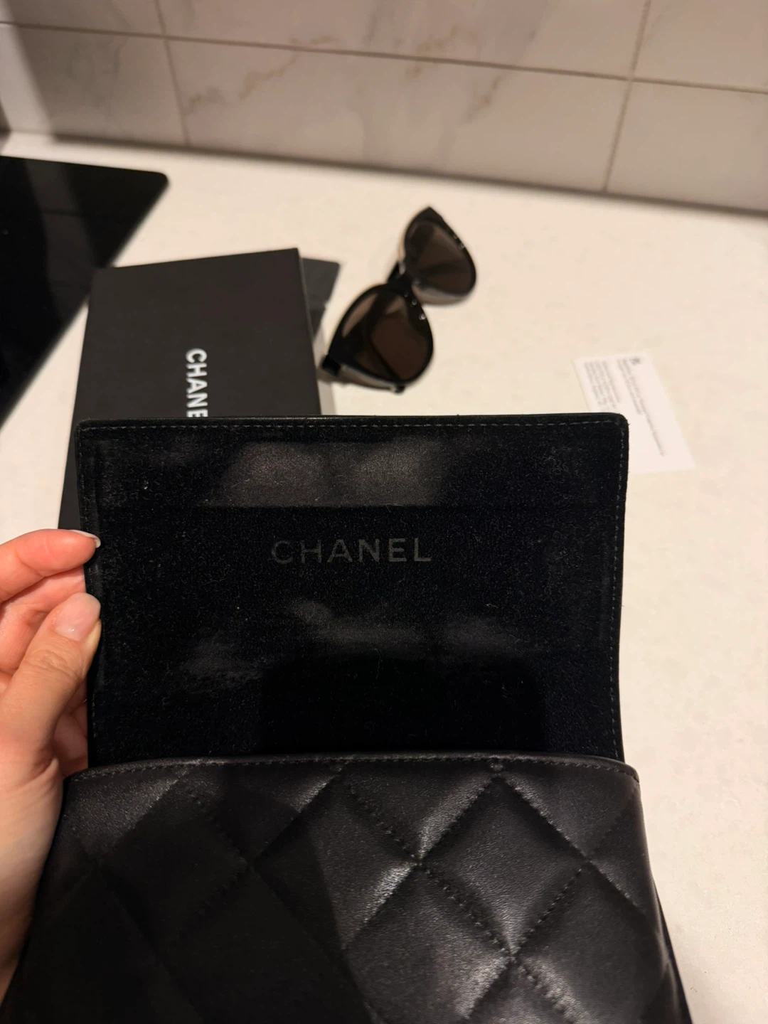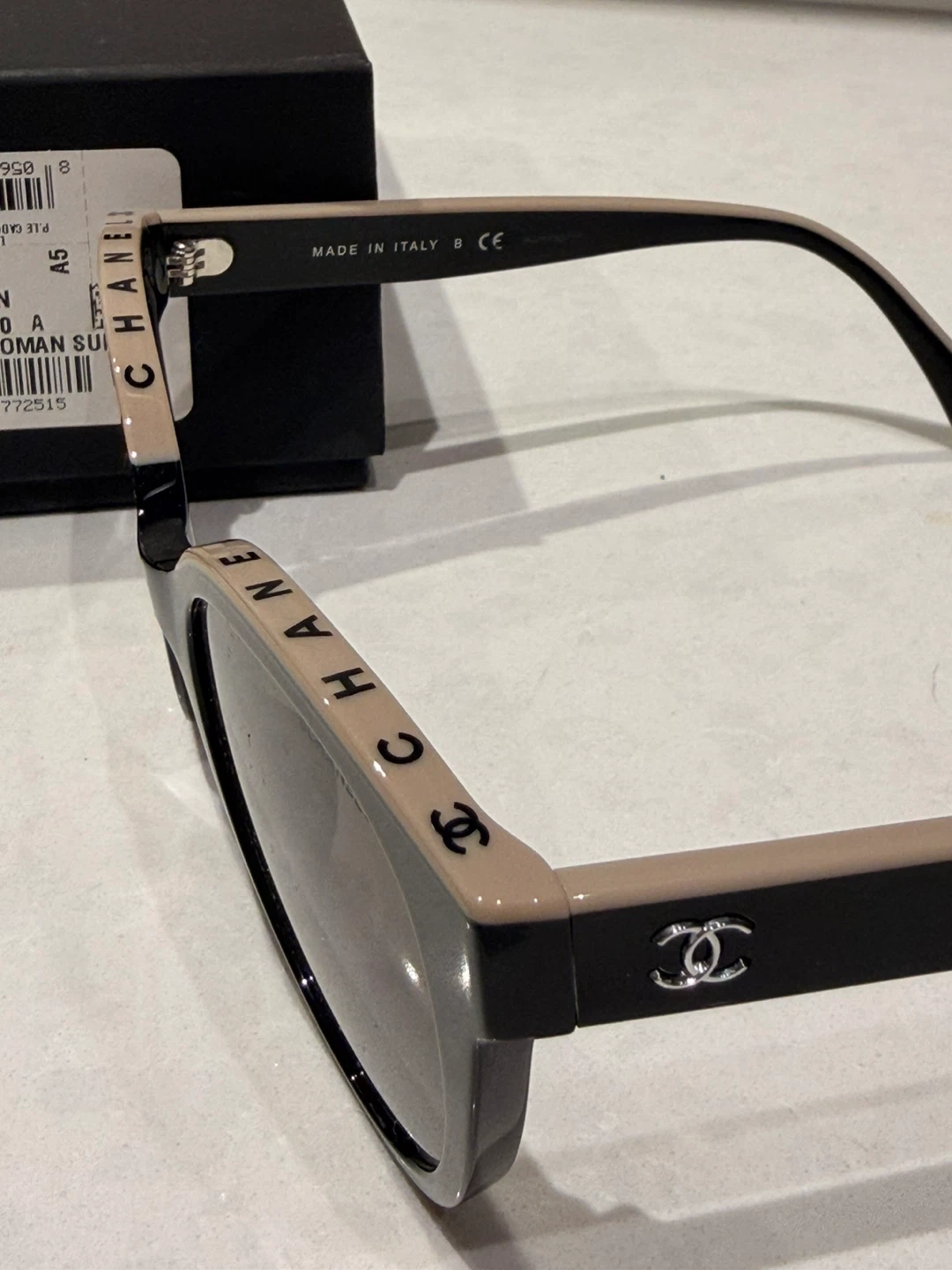 Chanel acetate woman sunglasses in black and beige. Made in Italy. Includes original box and case. Serial number on the side