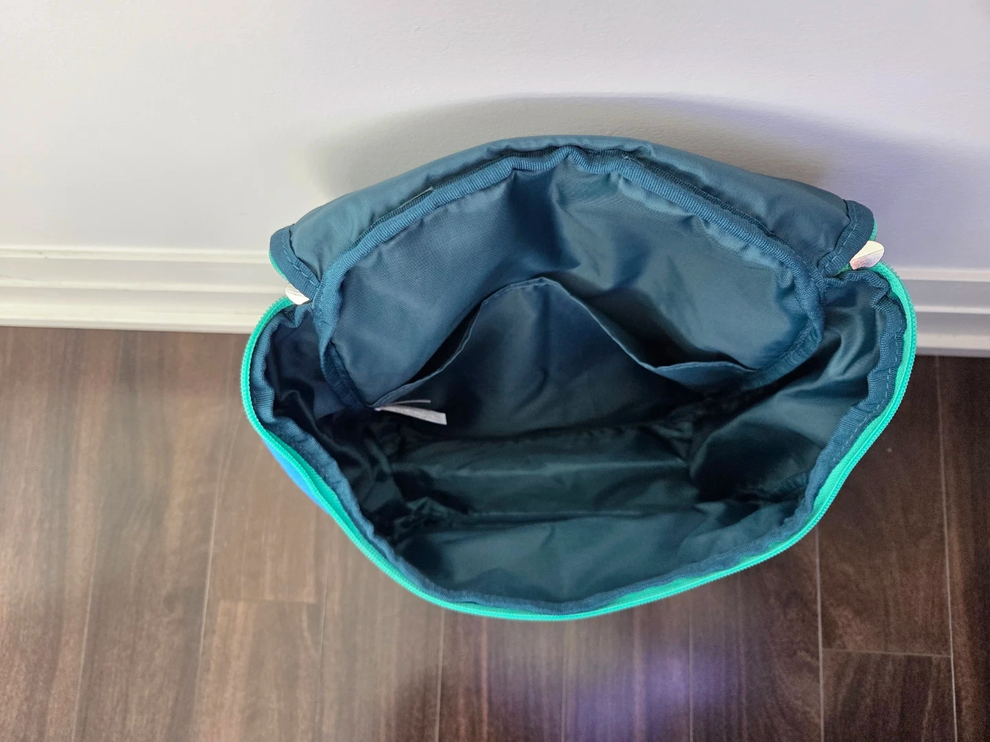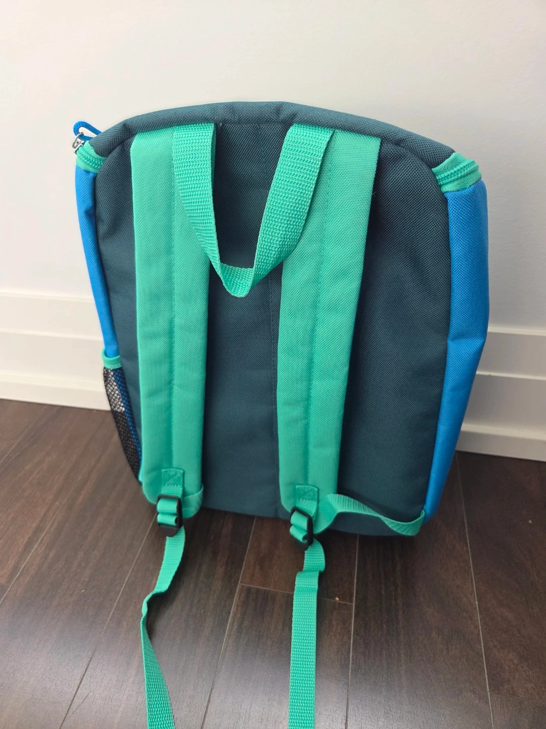 This Skip Hop backpack features a fun monster truck design. It has adjustable padded shoulder straps and a roomy main compartment. The front pocket is clear with a tire tread design inside.