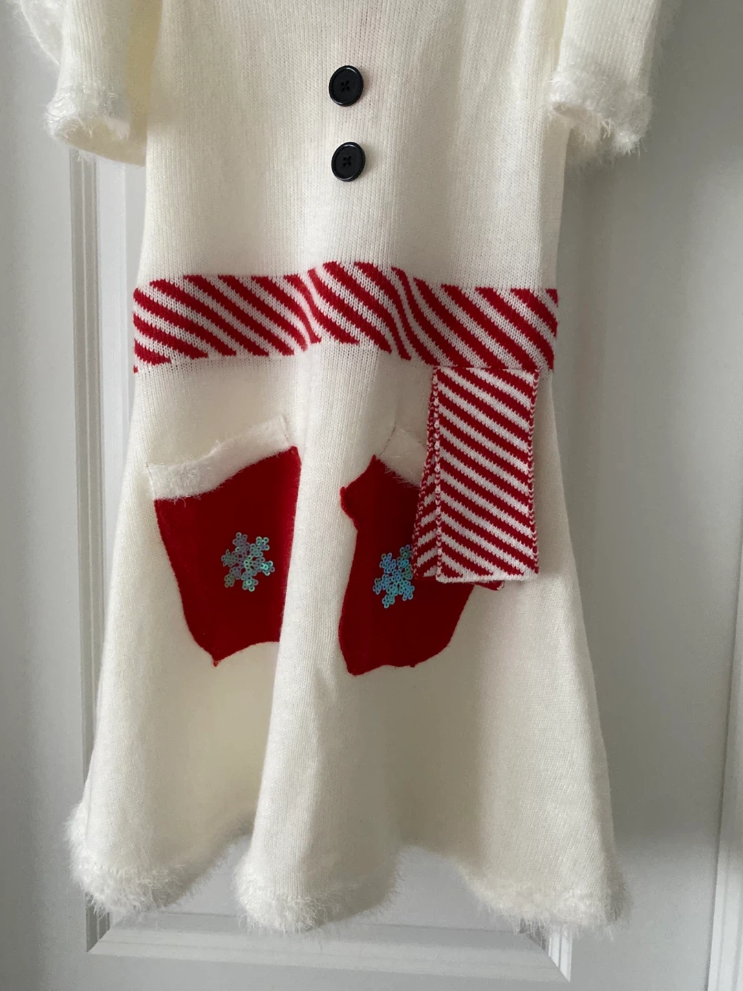 A cute STREETWEAR SOCIETY Christmas snowman dress! It's white with red accents and a red and white striped belt. It has a fuzzy texture and is a size 6