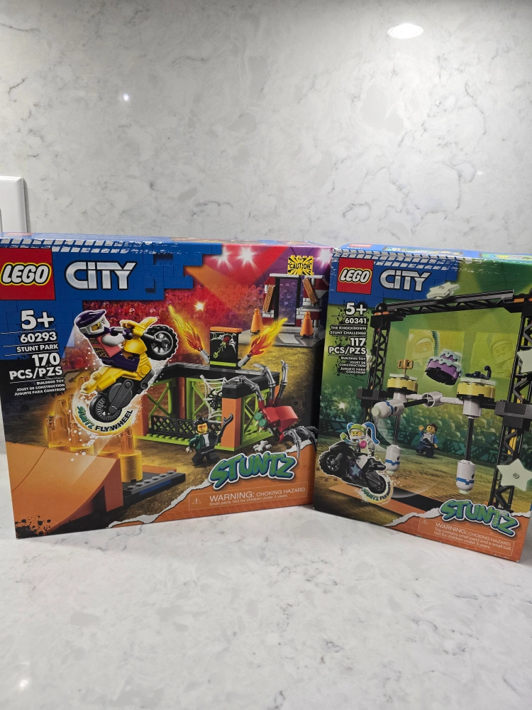 Selling two LEGO City Stuntz sets! Both are suitable for ages 5+. One is set 60293 Stunt Park with 170 pieces, and the other is set 60341 The Knockdown Stunt Challenge with 117 pieces. Great for building and imaginative play!