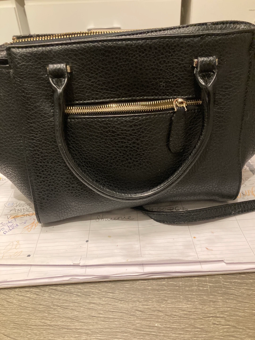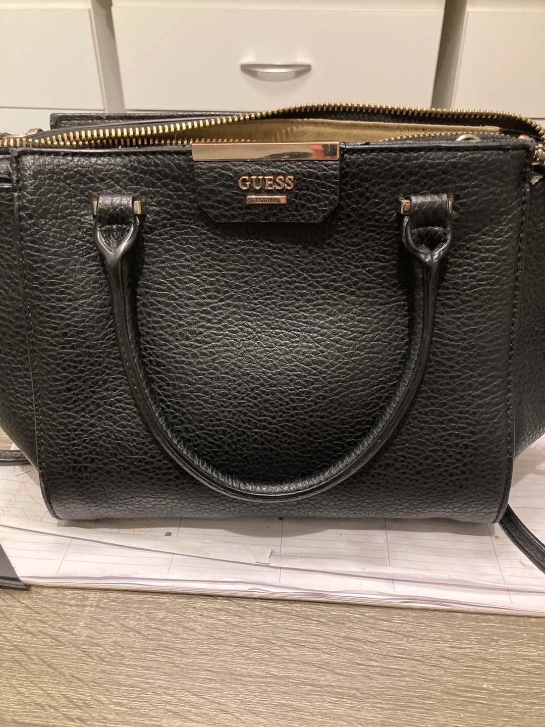A stylish black pebbled leather satchel handbag from Guess. It features gold-tone hardware and a zip-top closure. This handbag is perfect for everyday use.