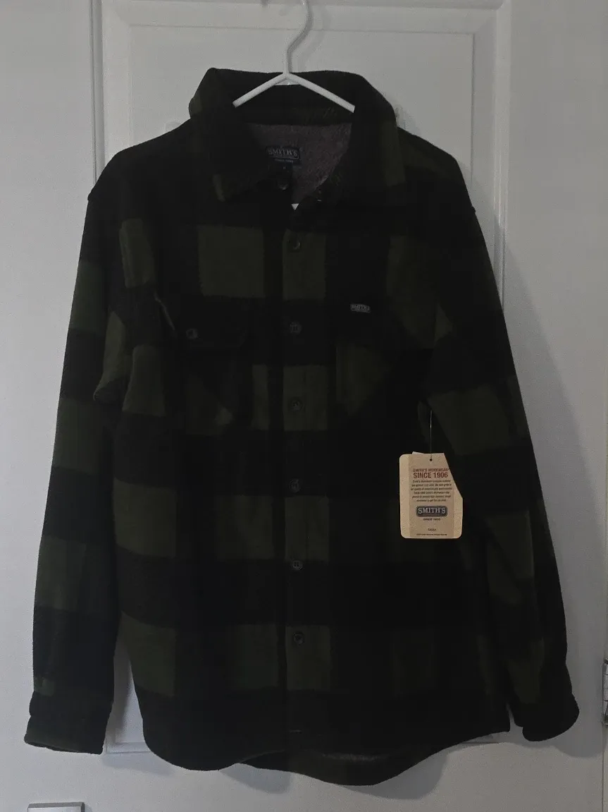 This Smith's Workwear flannel shirt jacket features a green and black plaid pattern. It's lined for extra warmth. It includes two chest pockets with button closures.