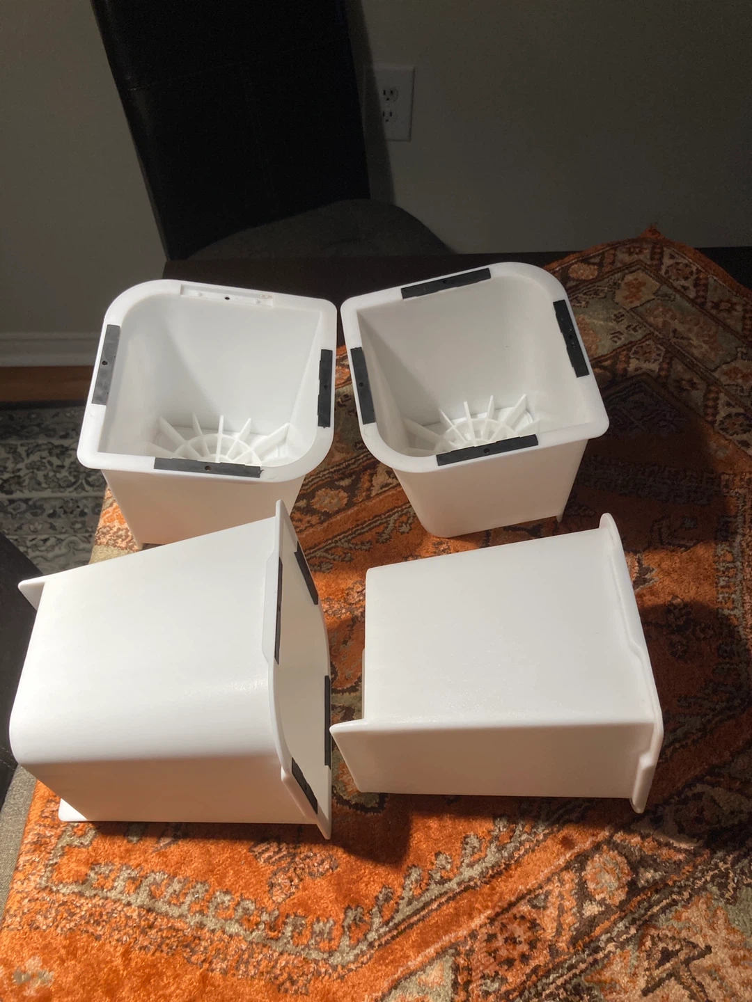 This is a set of four white plastic appliance or furniture risers. They're designed to lift appliances off the floor. The risers have a sturdy construction.