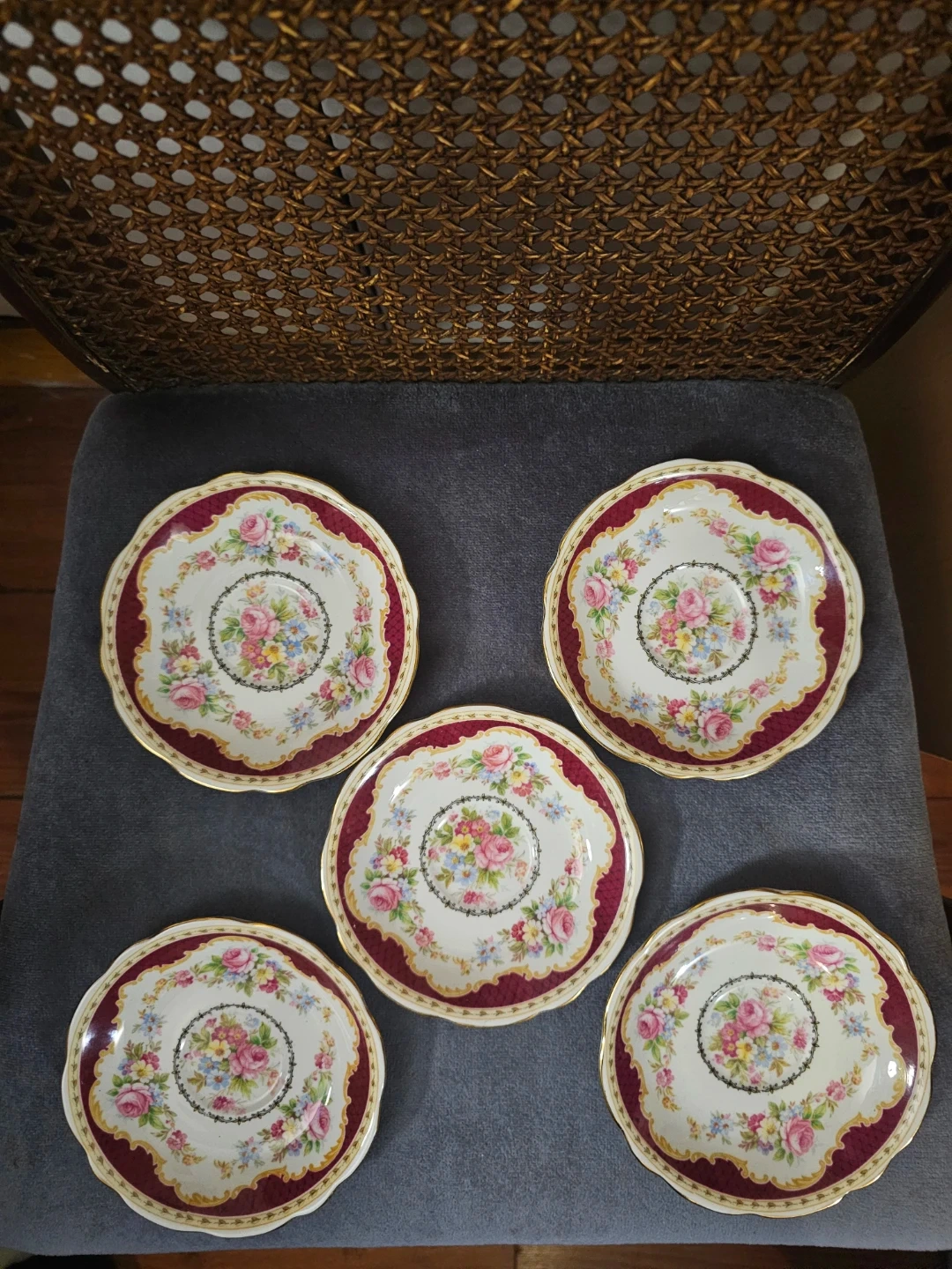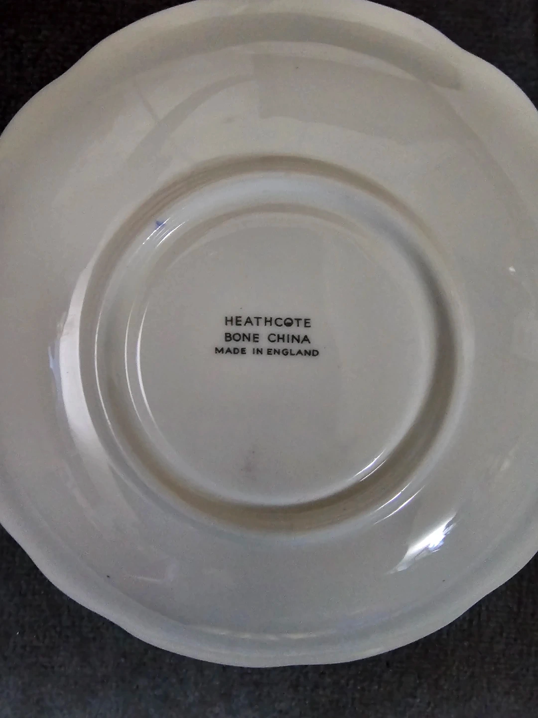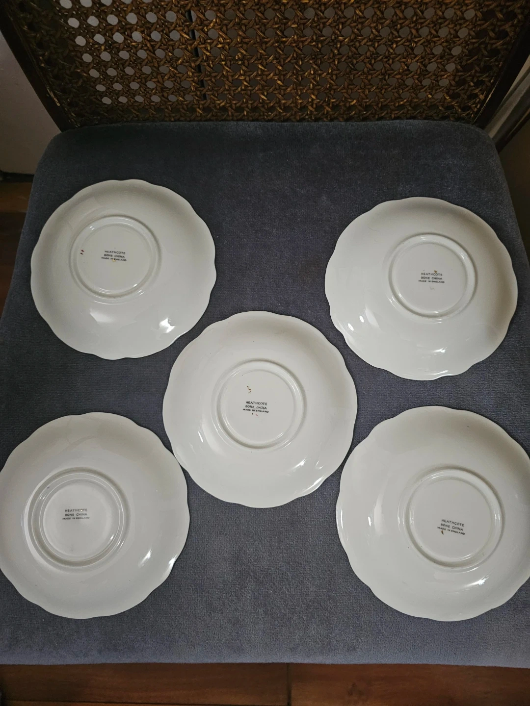Selling a set of 5 Heathcote Bone China saucers, made in England. They have a lovely floral design with a burgundy trim. Perfect for adding a touch of elegance to your tea set! $10 each