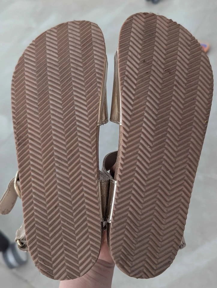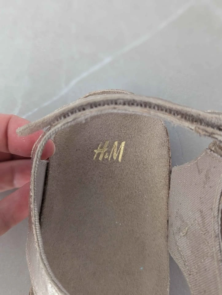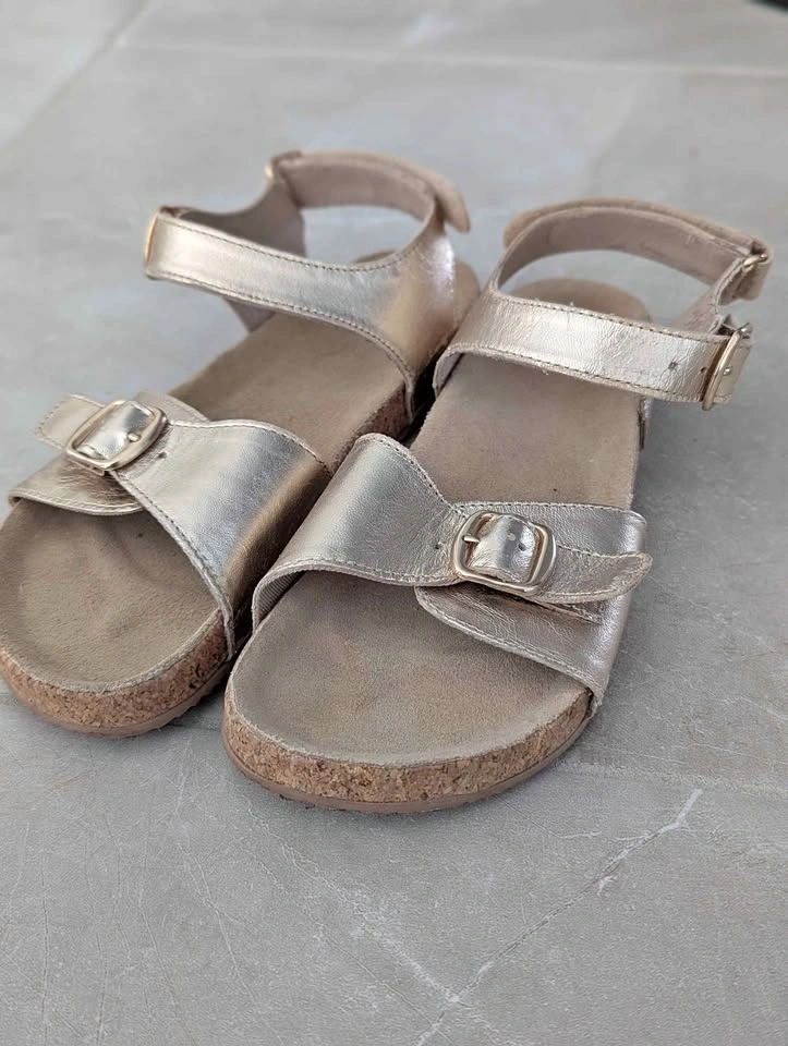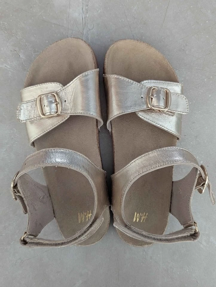 Shiny H&M gold sandals for kids in size US 1.5 (EUR 31). Features a cork-style sole and adjustable buckle straps for a secure fit. Leather design with a fun metallic finish. Great for summer outfits. Worn a few times, in excellent condition.