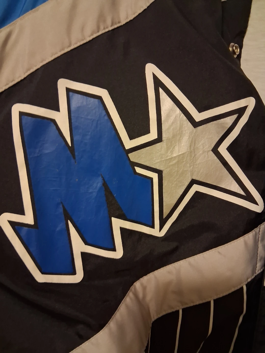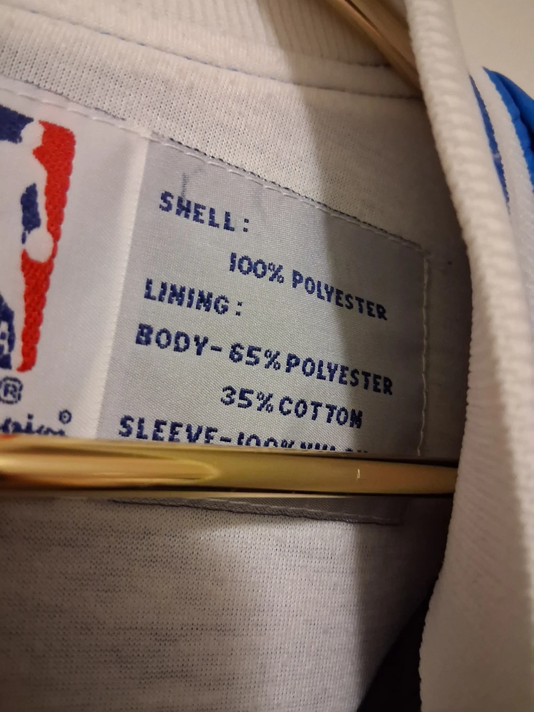 Champion Orlando Magic bomber jacket. Shell is 100% polyester, lining is 100% polyester, and the body is 65% polyester and 35% cotton. This is a great jacket for any basketball fan!