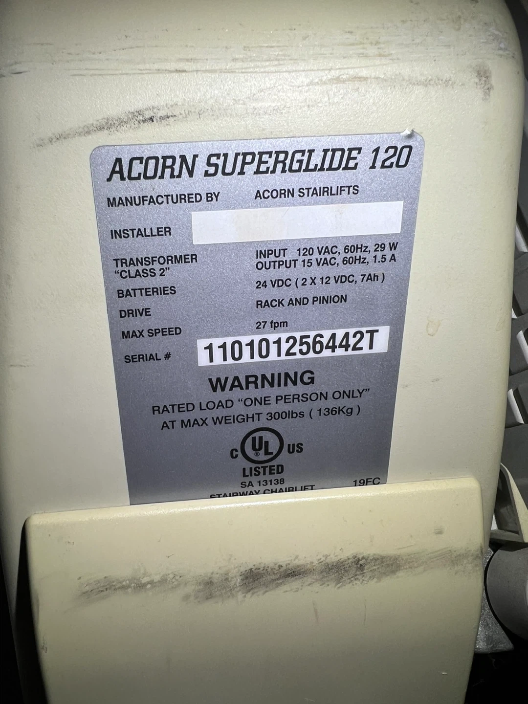 This is a used Acorn Superglide 120 stair lift for the right side of the stairs. It can be used for the left side as that is how it is setup now.