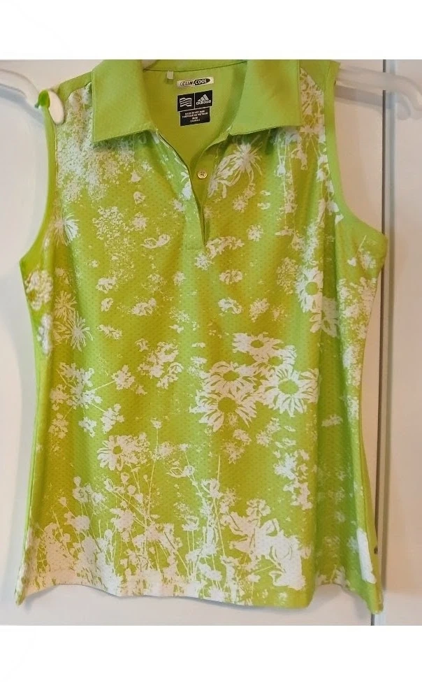Adidas women's sleeveless polo shirt with a floral print. Features Climacool technology for breathability. Made in Vietnam. Size M/M.