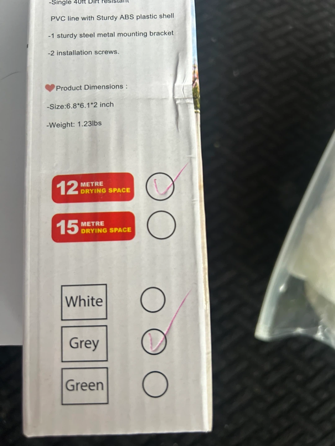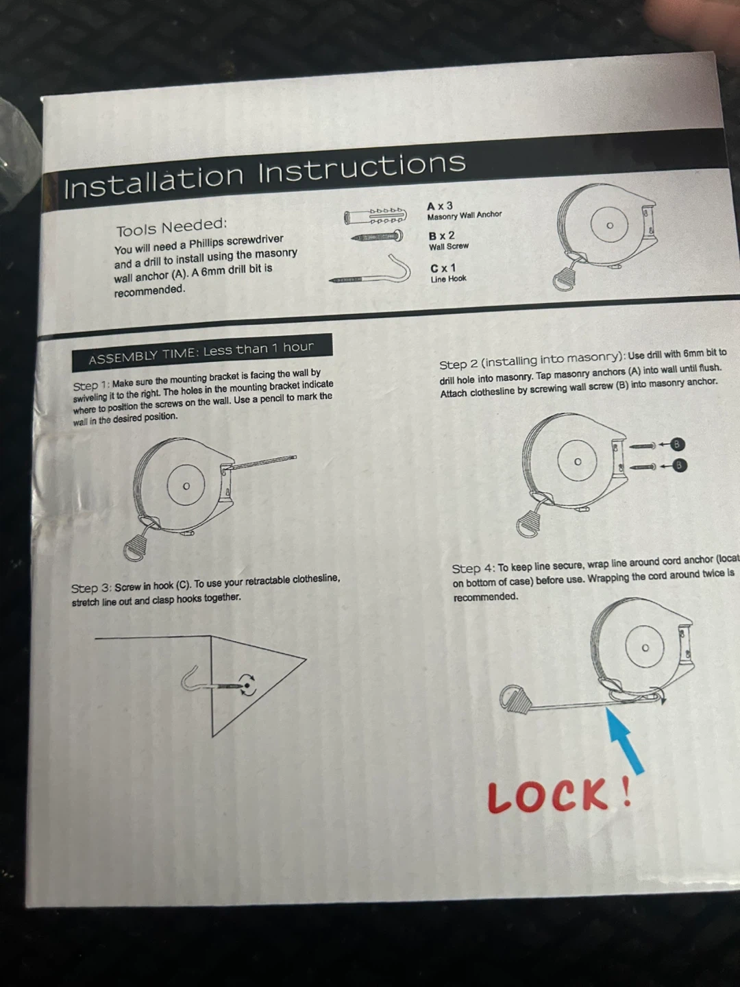 This is an outdoor retractable clothesline with a heavy-duty drying capacity. It features a single 12-metre retractable line with a sturdy ABS plastic shell. Includes a mounting bracket, masonry wall anchor, screws, and a line hook for easy installation. It's great for saving space in your yard!