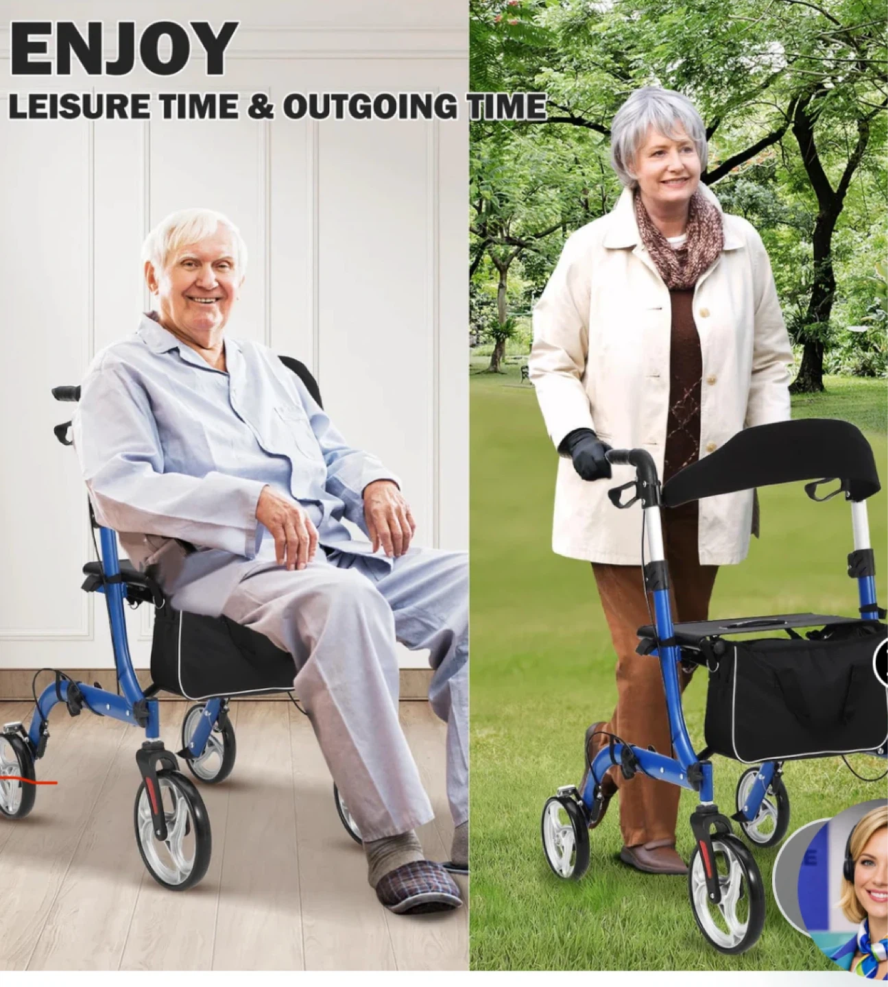This four-wheel walker features a built-in seat and a convenient storage bag. It offers speed control with braking and deceleration by handle. The wheels are lockable for enhanced safety. It's designed for leisure time and outgoing activities.