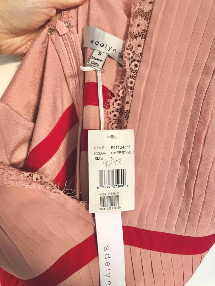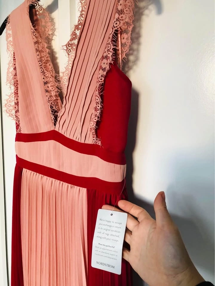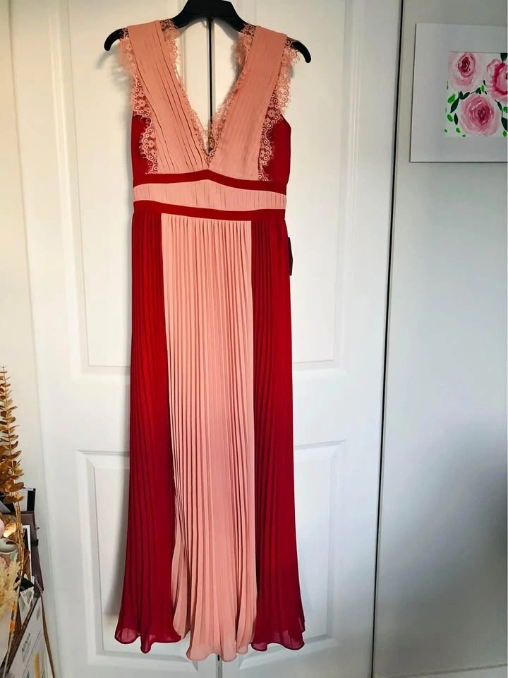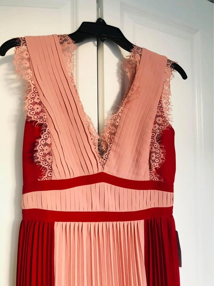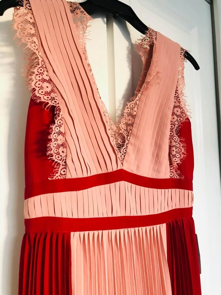 Brand new with tag. Bought from Nordstrom for $92.98 + tax. Size S. Sleeveless, perfectly pleated dress with bright color blocking and lace detailing, to look chic, elegant and super trendy, day or night! Features a V-neckline with lace detail, back zipper, and is floor length. Dry clean only.