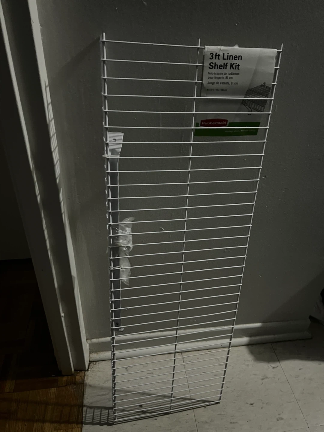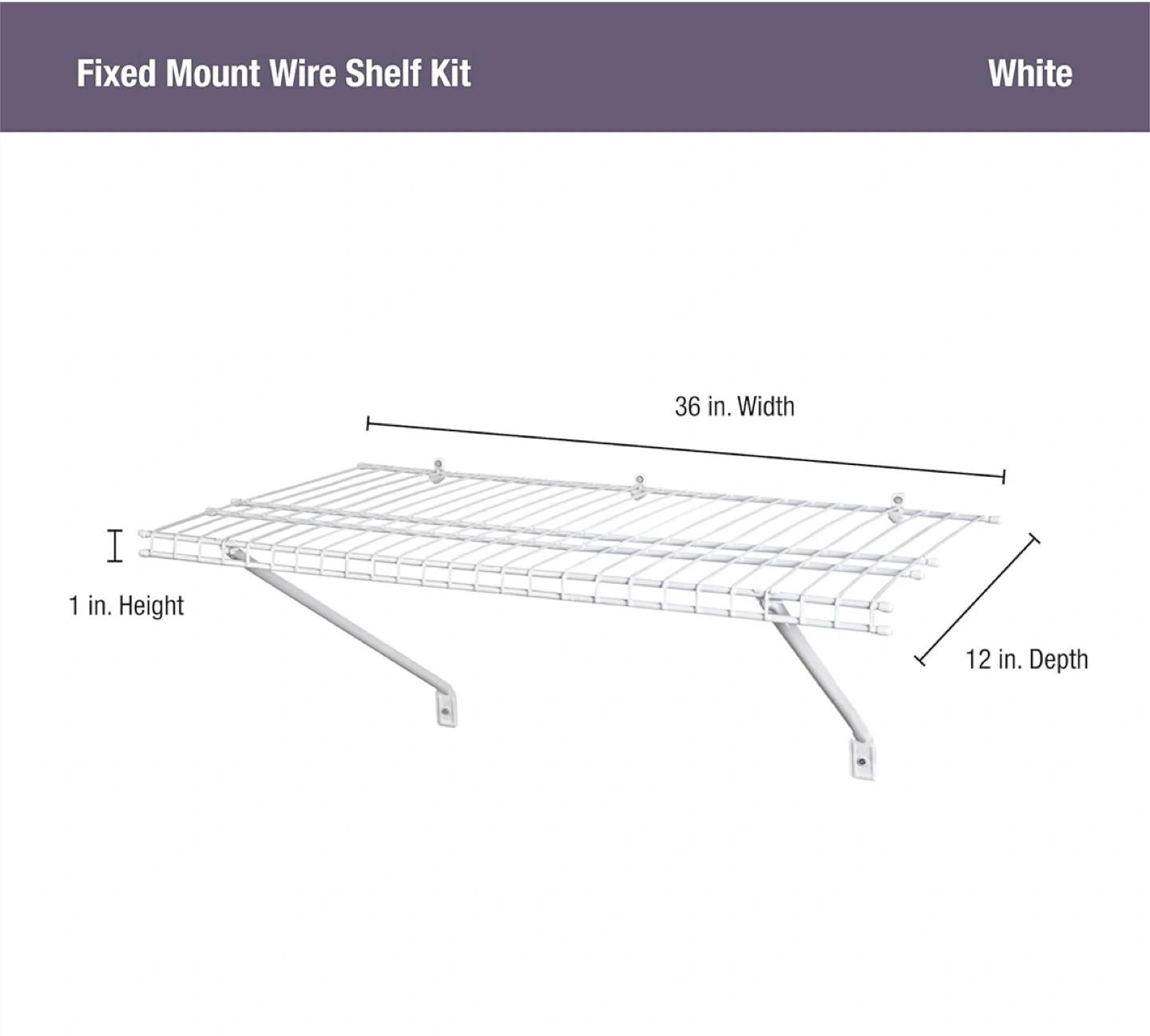 Selling a Rubbermaid 3ft Linen Shelf Kit in white. It's a fixed mount wire shelf kit, perfect for adding extra storage space. The dimensions are 36 inches in width, 12 inches in depth, and 1 inch in height. Great for organizing your linens or other items!