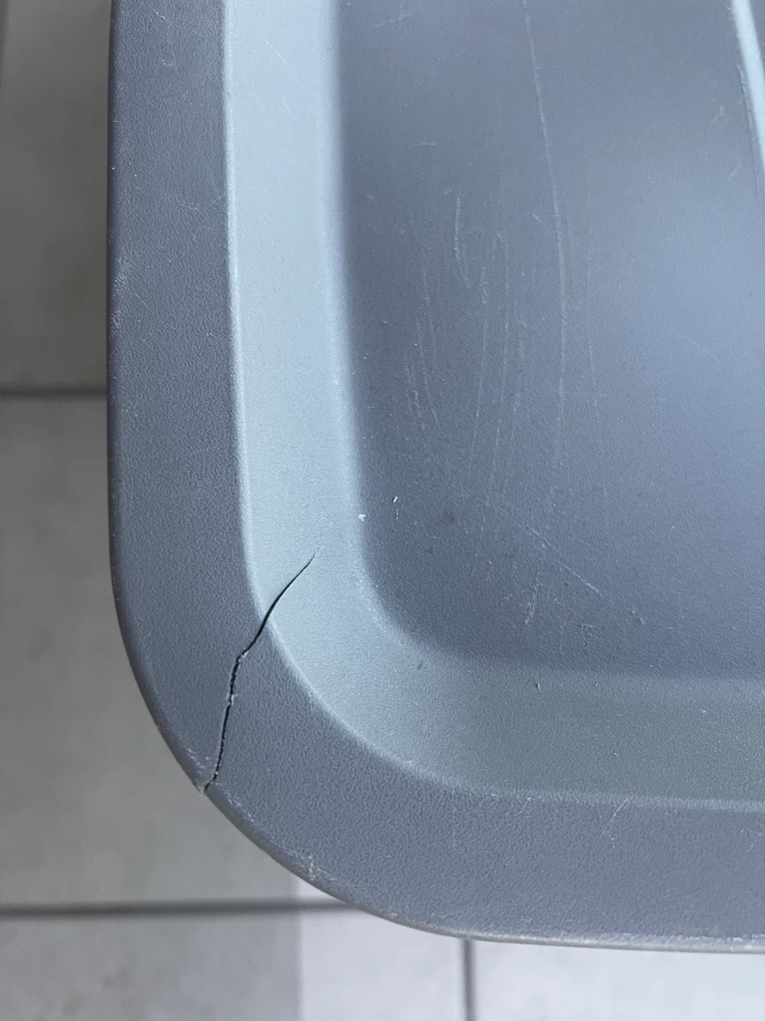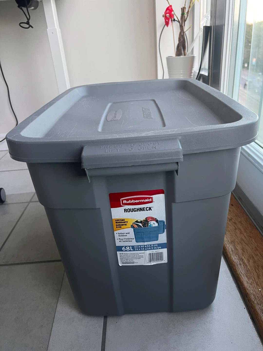 Selling a Rubbermaid Roughneck 68L storage box in grey. It has a few cracks on the lid (see photos). Still works great for storage though! And sturdy