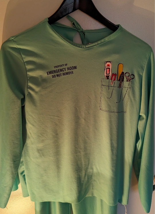 Selling a Rubie's brand emergency room scrubs costume! It's a size large and comes with the top and pants. The scrubs are a light green colour and have a fun design on the pocket. Perfect for a costume party or Halloween