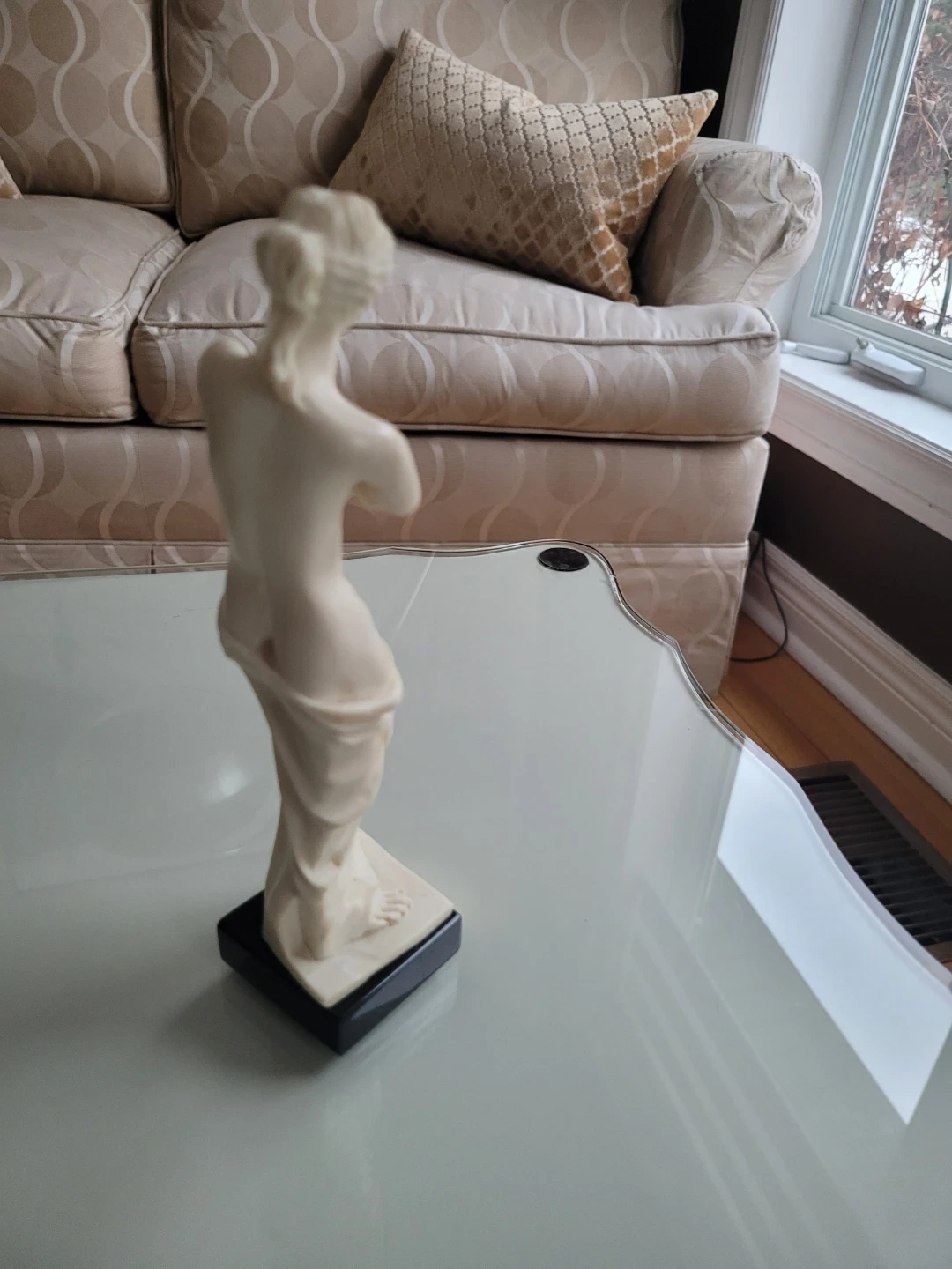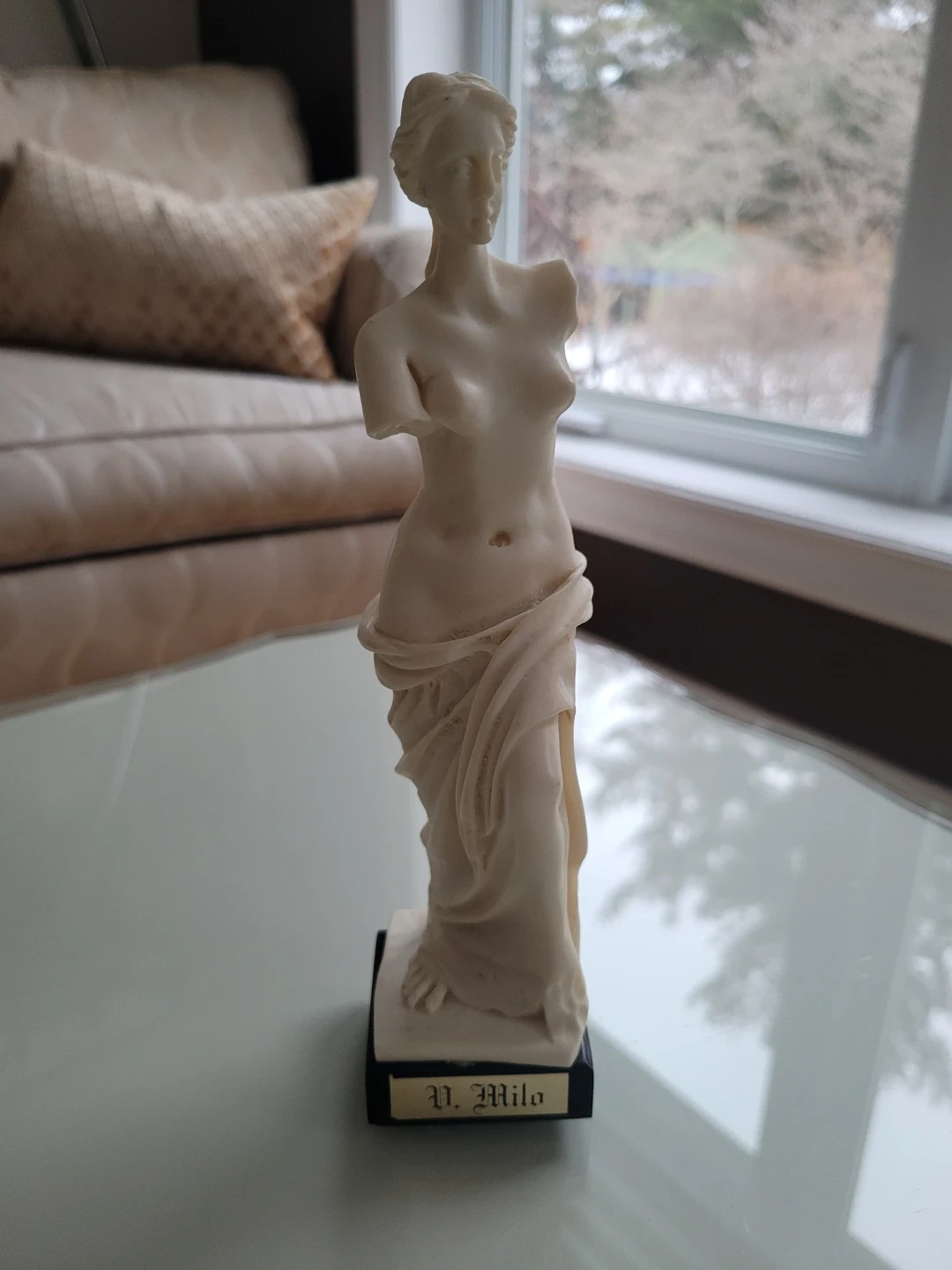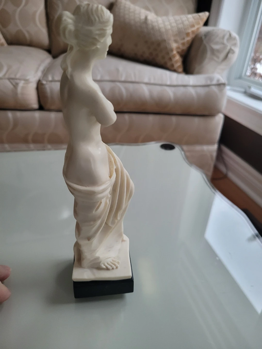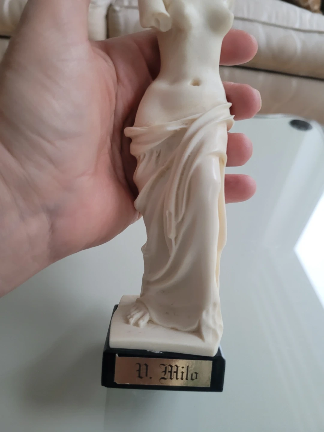 This is a decorative figurine of the Venus de Milo. Made from a cream-coloured resin. A classical piece for display. H: 8.5"
