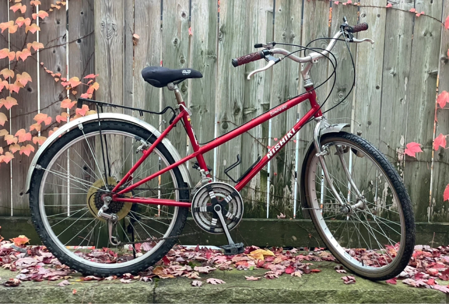 387PERFECT winter transportation. ATTENTION RIDERS 5'5- 5'11 feet approx (163 -190cm) TOP Quality components, all terrain all season 80’s 12 speed hybrid is what you need to ride all Winter. The bike is almost perfect with Zero Rust in any component. Ready to Ride SAFELY in rain or snow, this NIKISHI Bombardier is made in Canada superior quality from German and Japanese components and ready to ride home today. The wheels are rare sealed bearing Japanese construction and the fork is pure chrome ( that quality you will not find without spending a fortune). Back rack / FULL front and back fenders with bottle cage gel comfort seat to pad the bumpy Toronto streets. 12 smooth shifting speeds will have you tackling any hill with a smile even with heavy books or groceries on the rear Rack Upright cruiser handlebars keep you in a safe upright riding position to see above cars in traffic and are easier on your back. "CHANGSTAR" super sexy large brake levers are a piece of artwork in design and functionality. There is a beautiful wheel generated front light that might even work if you replace the bulb! If not it is a nice vintage element. The only thing that makes it less than perfect is a dent in the rear fender which is inly cosmetic but does not affect functionality. If you want a stylish safe and super comfy ride, come test drive this beauty today near Sherbourne and Wellesley streets with free curbside parking if needed. This bike is so well made it can be passed down to the next generation Send me a message with number and available days times to set up a test drive. Cheers and safe happy cycling. #fall #autumn #bike #bicycle #road #commuter #hybrid #cruiser #cycle #bike #roadbike #transportation #noTTC #ride #excersize #cruiser #comfort #Bikezone #bikingzone #vintage 80s #ninetees # Ruby Red Vintage Safe Solid Winter Beast of a Bike. FINEST QUALITY Components bike. BEAUTIFUL!