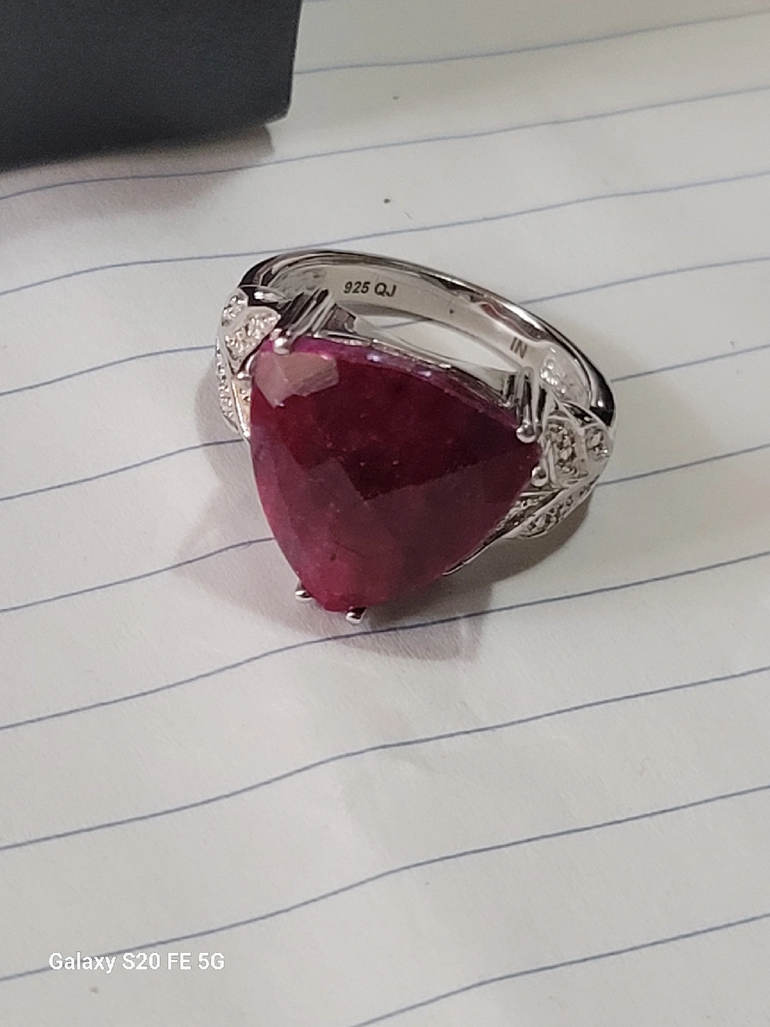 A beautiful ruby set in a sterling silver ring. The band is marked '925 QJ'..Size 7..